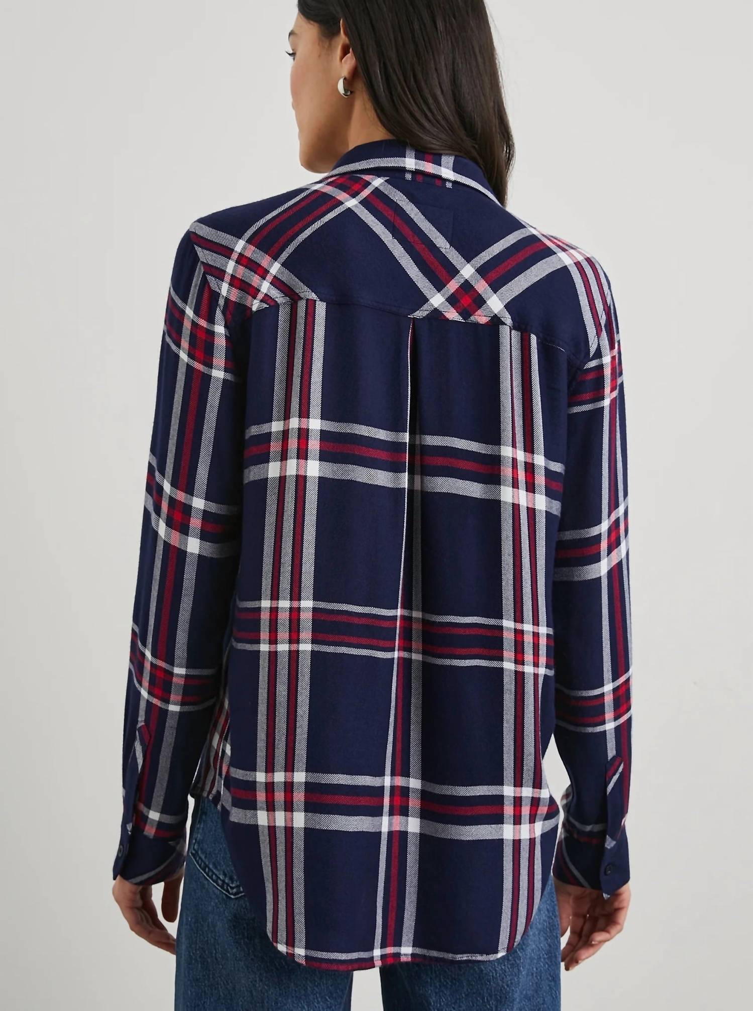 Perfectly tailored and soft to the touch. Discover the timeless elegance of the Hunter Shirt by Rails, crafted in 100% Rayon for an ultra-soft hand-feel reminiscent of cashmere. This Patriot Navy Red piece is adorned with a plaid pattern, offering a rich stripe design that complements any wardrobe with ease. Designed with long sleeves and a collar, it provides a sophisticated look without the need for closures. Complete with practical pockets, this shirt blends style and functionality effortlessly.