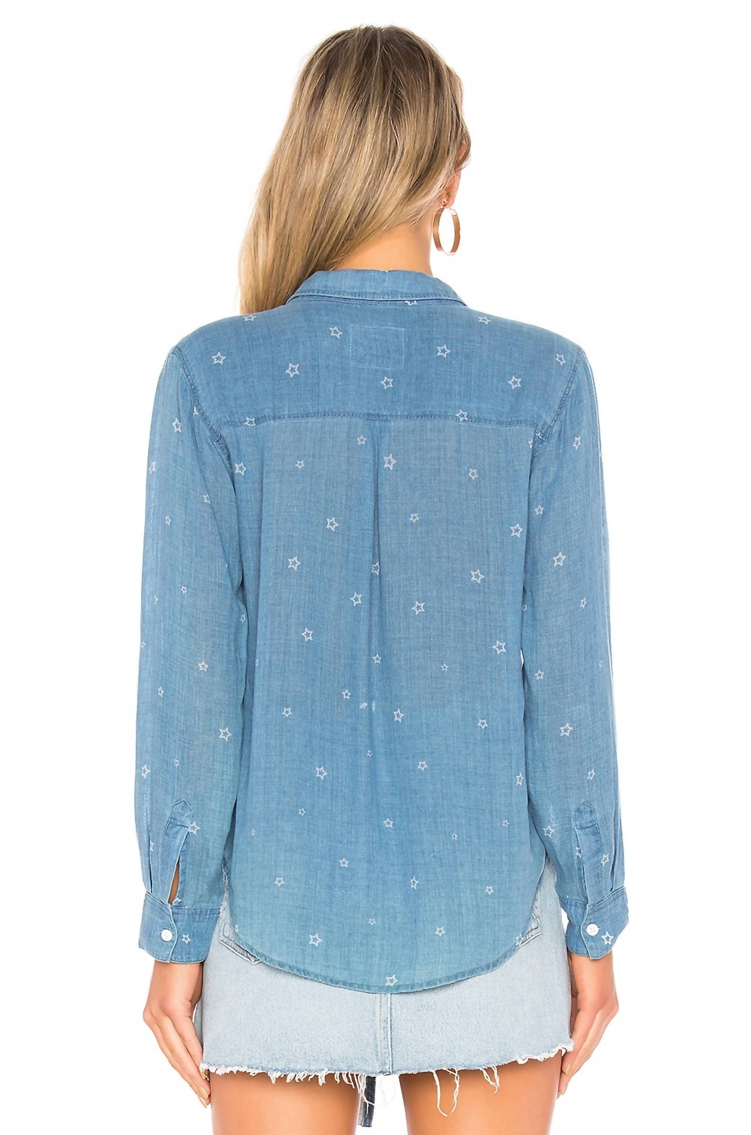 Super soft and lightweight long sleeve denim button-down top with white star detail. 70% Tencel / 30 Linen. Imported. CARE / Machine Wash Cold. Tumble Dry Low. Remove Promptly. No Bleach.