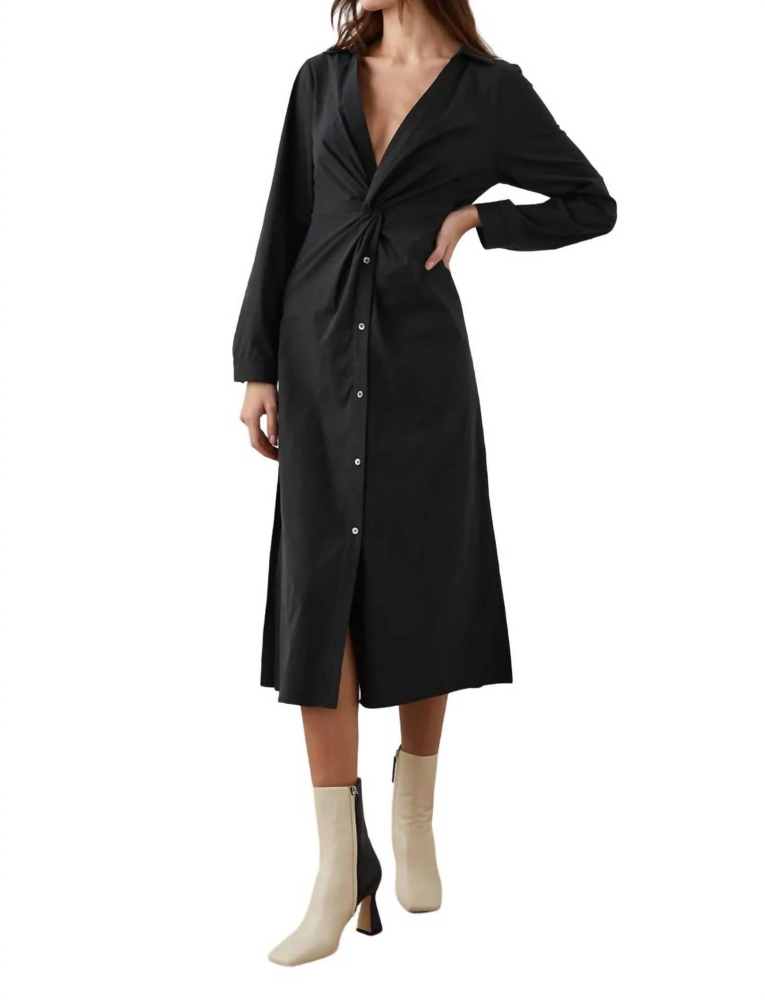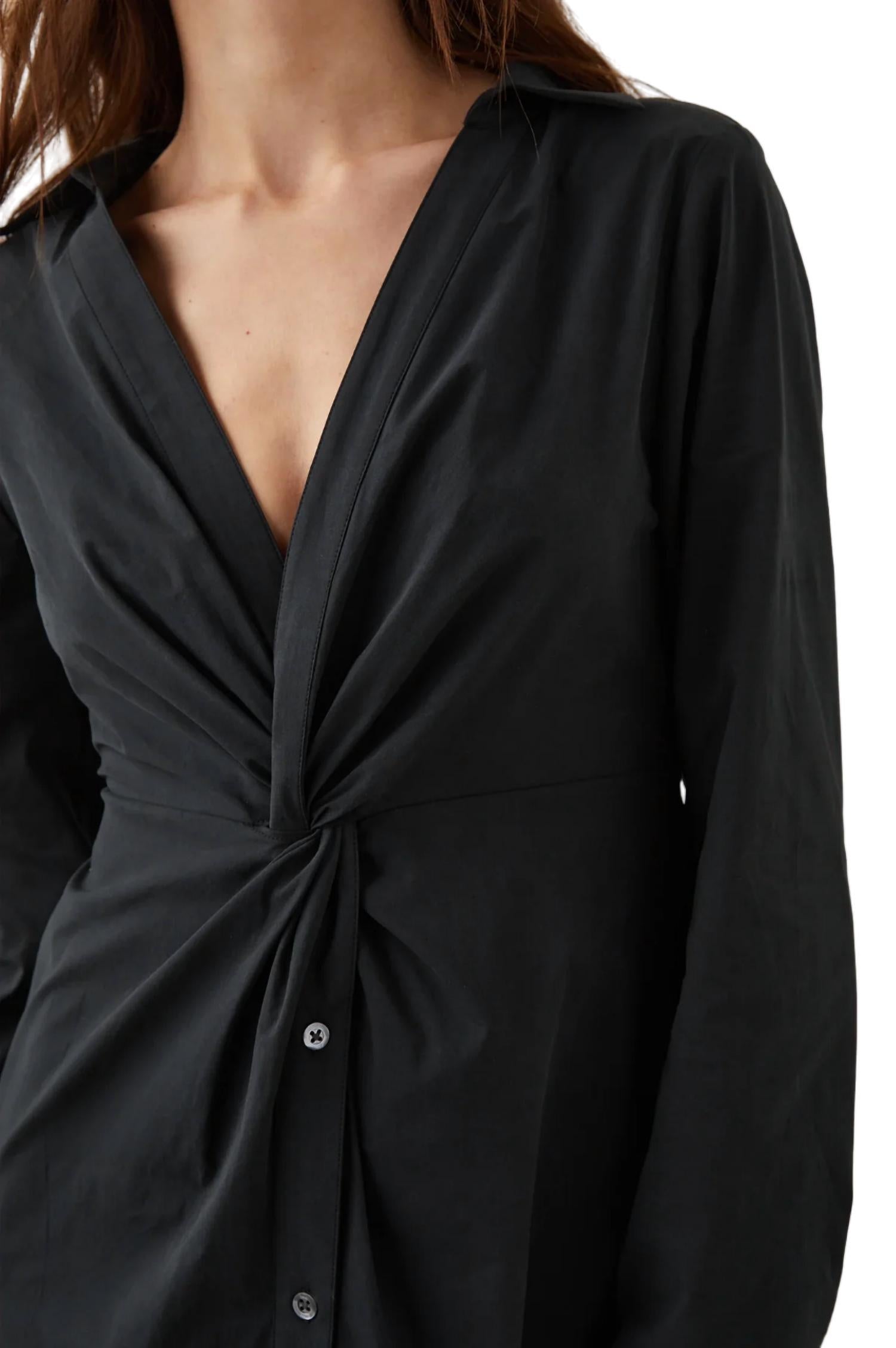The perfect length dress does exist.Featuring a deep v-neckline, open collar, and focal-point detailing at the waist with a twist-front bodice, this button-front silhouette has a back elastic waist. Made from 55% cotton, 43% Tencel, and 2% stretch. Imported. Recommend ordering true to size. Front body length: 47 1/2" (measured from Small). Hand wash cold.