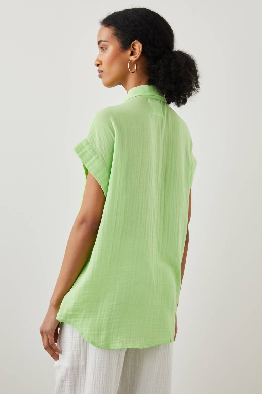 Pair this with your favorite jeans and slides for your next girls night out. Say hello to the Jamie Top by Rails, a chic essential for any woman's wardrobe from the Eco Collection. Crafted from 100% organic cotton, this button-down blouse comes in a vibrant Jade Lime hue with a relaxed, slightly boxy fit. Sleeve Length: Cap. Care: Hand wash cold, do not bleach, lay flat to dry, low iron if necessary, do not dry clean. Imported. Featuring a stylish collar neckline, this piece promises to elevate your everyday ensembles effortlessly.