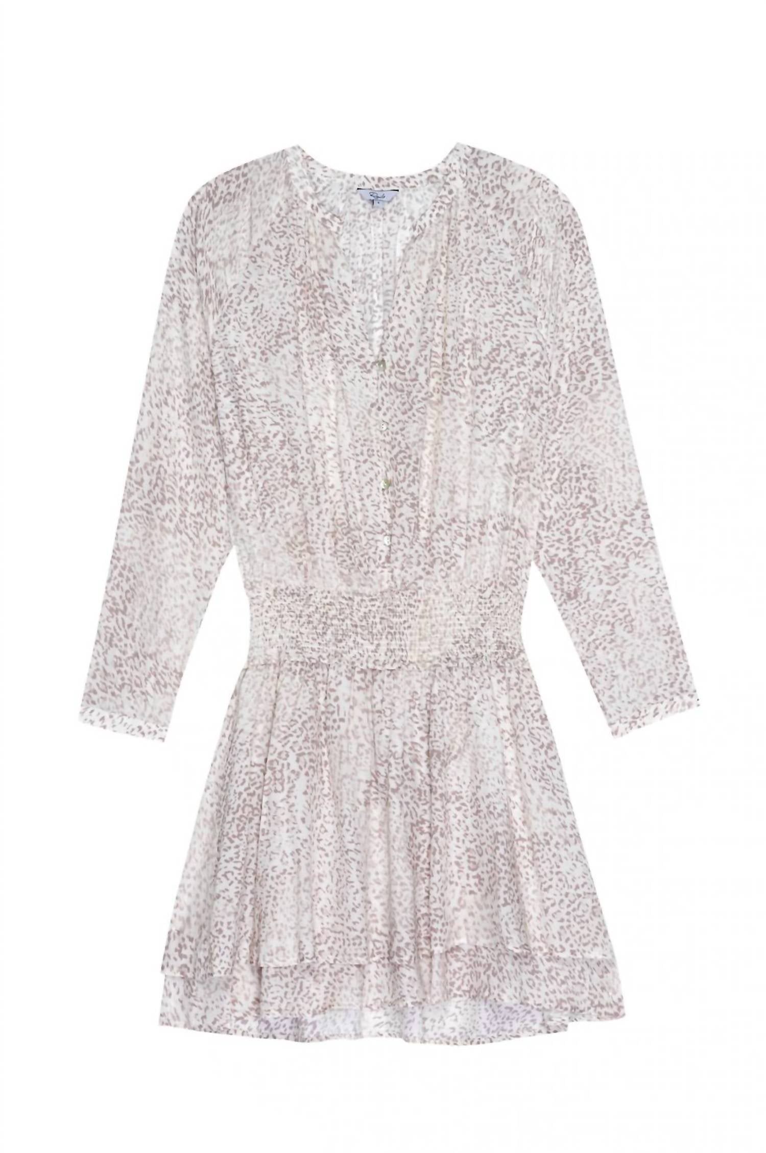 A pullover style body with an elastic waistline and flowy skirt. Long sleeve ivory v-neck mini dress features a watercolor leopard print design and buttons at center front. Dry Clean Only. 60% Rayon, 40% Viscose.