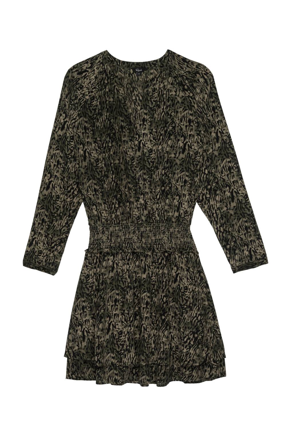A short and breezy dress for those warmer days. Ultra lightweight, satin crepe, long sleeve, unlined, olive green and brown mini dress featuring black abstract tiger design throughout, v-neckline, front loop fabric covered buttons, classic fit, smocked elastic waist, and double layered tiered skirt. 60% Rayon | 40% Viscose. Imported. Recommend ordering true to size. Front Body Length: 35 1/2” (Measured from Small). Model’s Measurements: Height 5’10 1/2”, Bust 31”, Waist 24”, Hips 35”. Dry clean only.