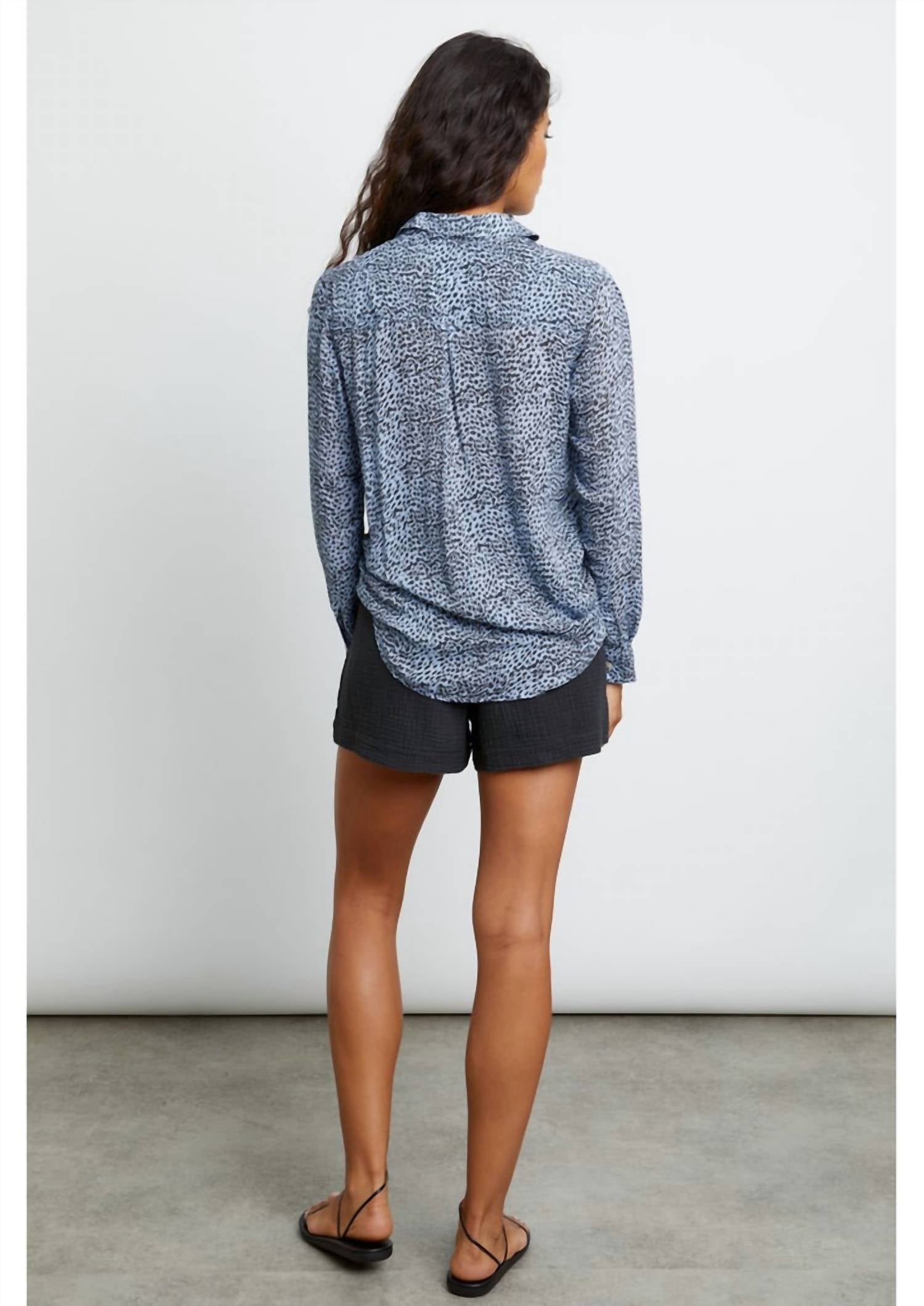 A stylish button-down crafted for elegance in dreamy blue with a striking black lynx print. Featuring long sleeves with button cuffs, a classic pointed collar, and a convenient patch pocket at the chest, this top offers a sophisticated touch to any wardrobe. Composition: 100% Rayon. Imported. Button closure. Hand wash, line dry. Garment Length: 26 inches.