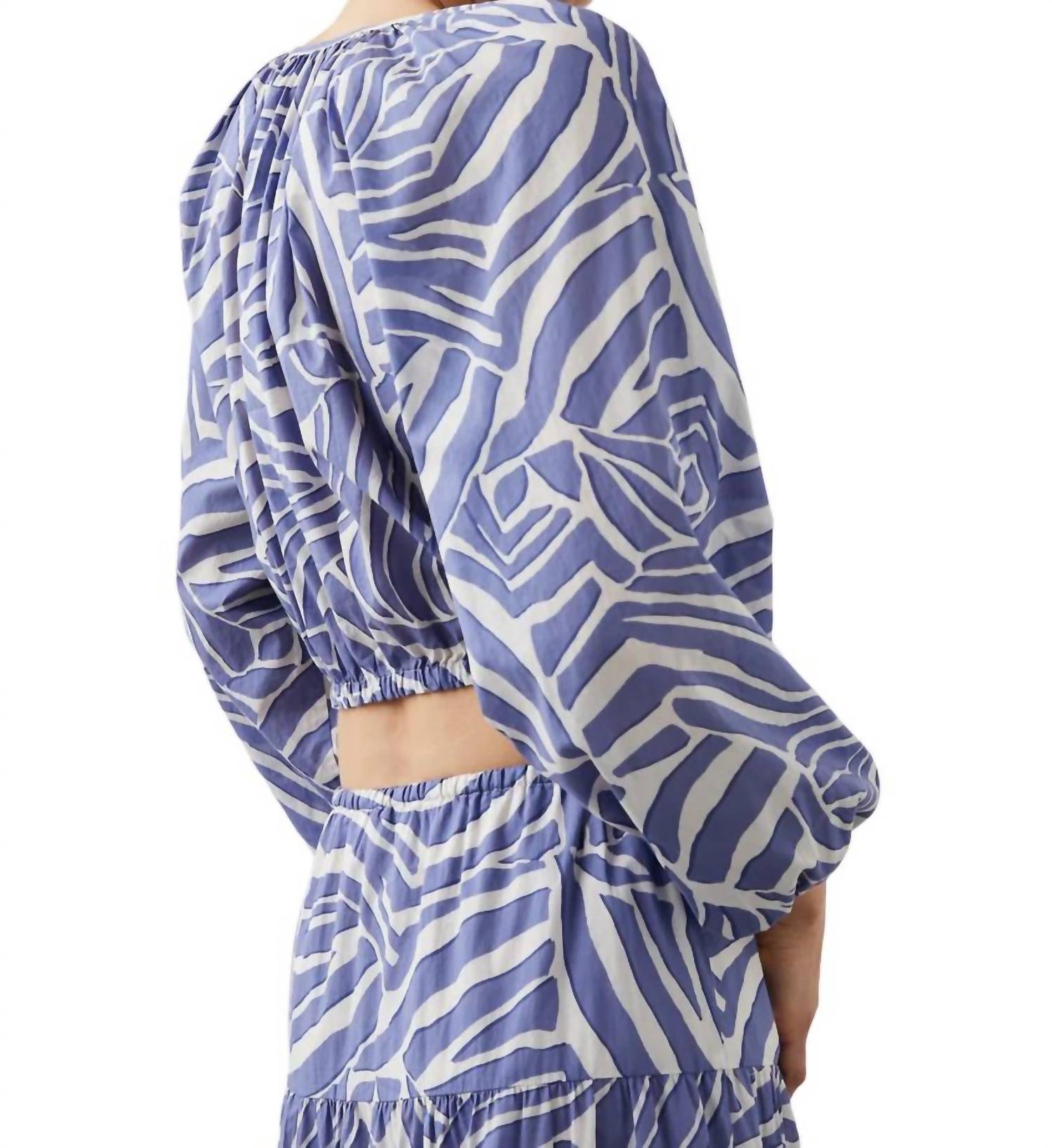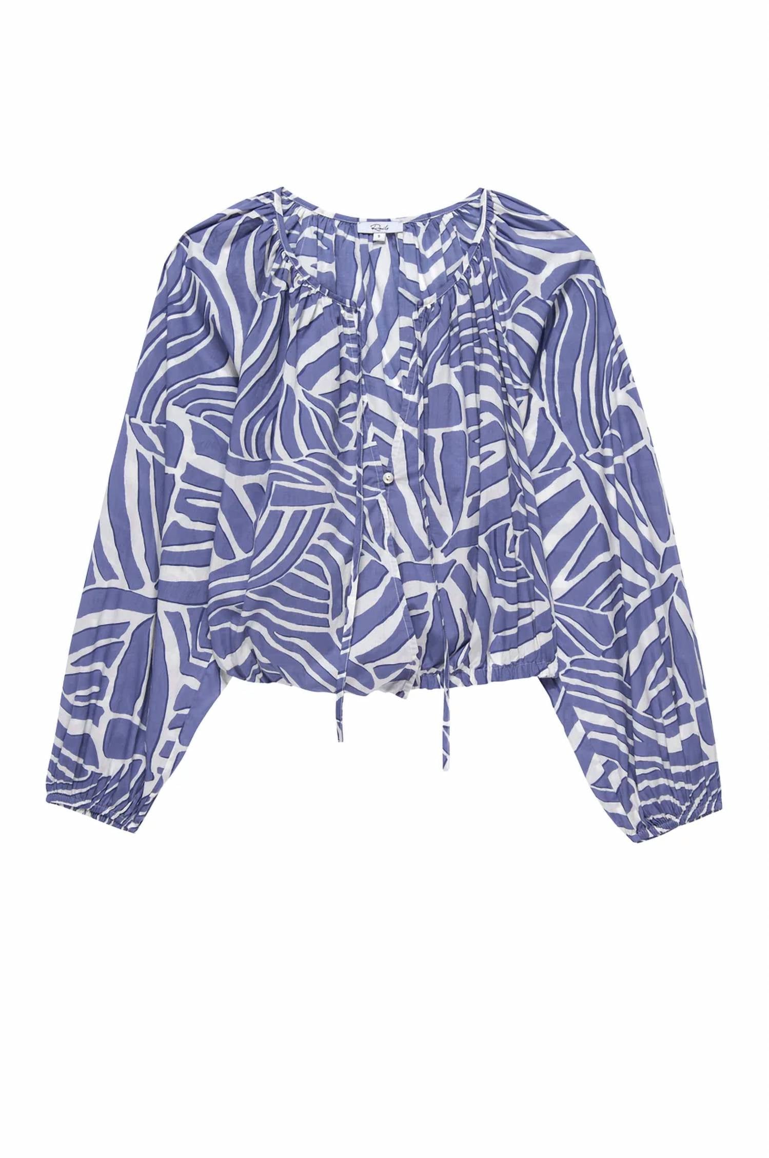 This blue and white patterned shirt features a plunging neckline with an adjustable tie and a crossover detail. Fabric: 100% Cotton. Hand wash cold. True to size. Model is wearing size S. Front Body Length: 17 3/4" (Measured from Small).
