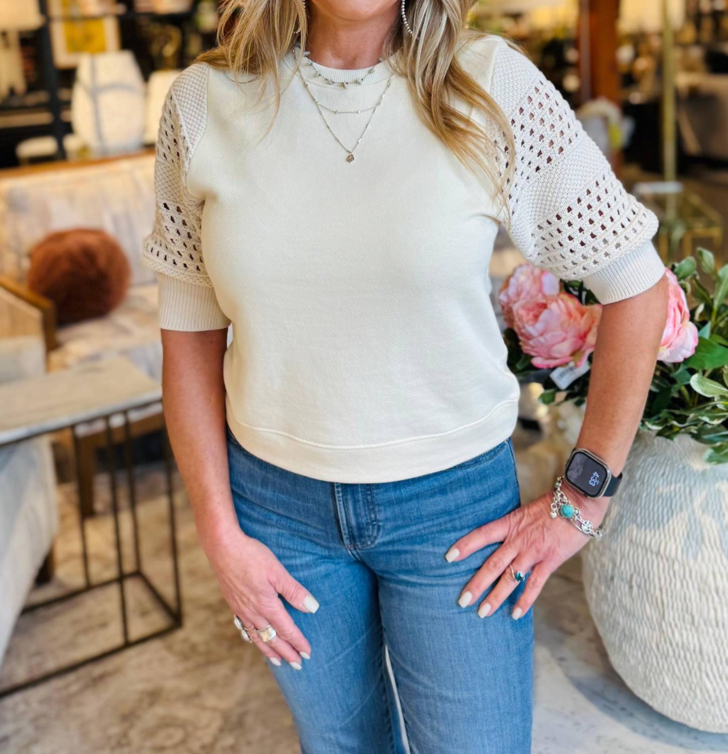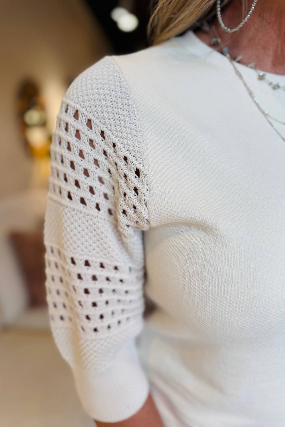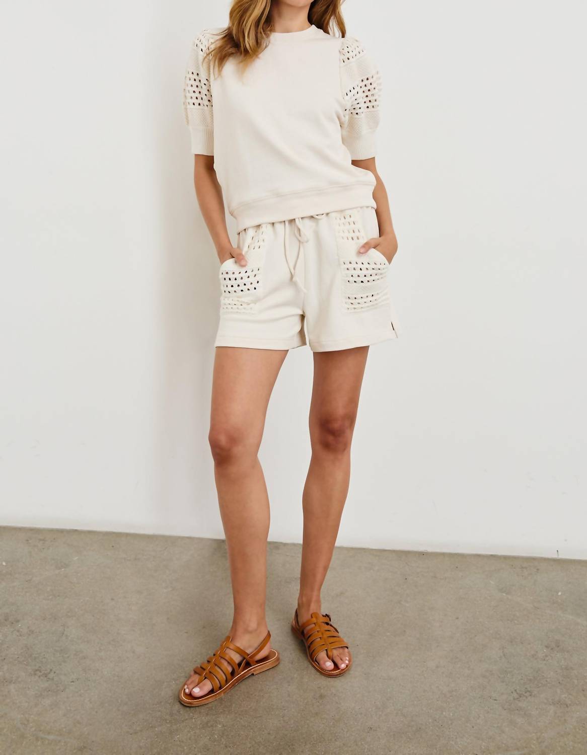 Cozy fabric, impeccable design - Meet the sweatshirt that you'll never want to take off. Experience the artisanal charm of the Kimberly Sweatshirt by Rails, a perfect blend of comfort and elegance. With its short, airy crochet balloon sleeves and a crewneck, this oat-colored sweatshirt embodies a harmonious combination of t-shirt and sweater. Crafted from 100% cotton, it is a versatile piece, pull-on by design, with a front body length of 19.5", measured from size small. Care is simple: hand wash with similar colors, lay flat to dry, and use a cool iron if needed.
