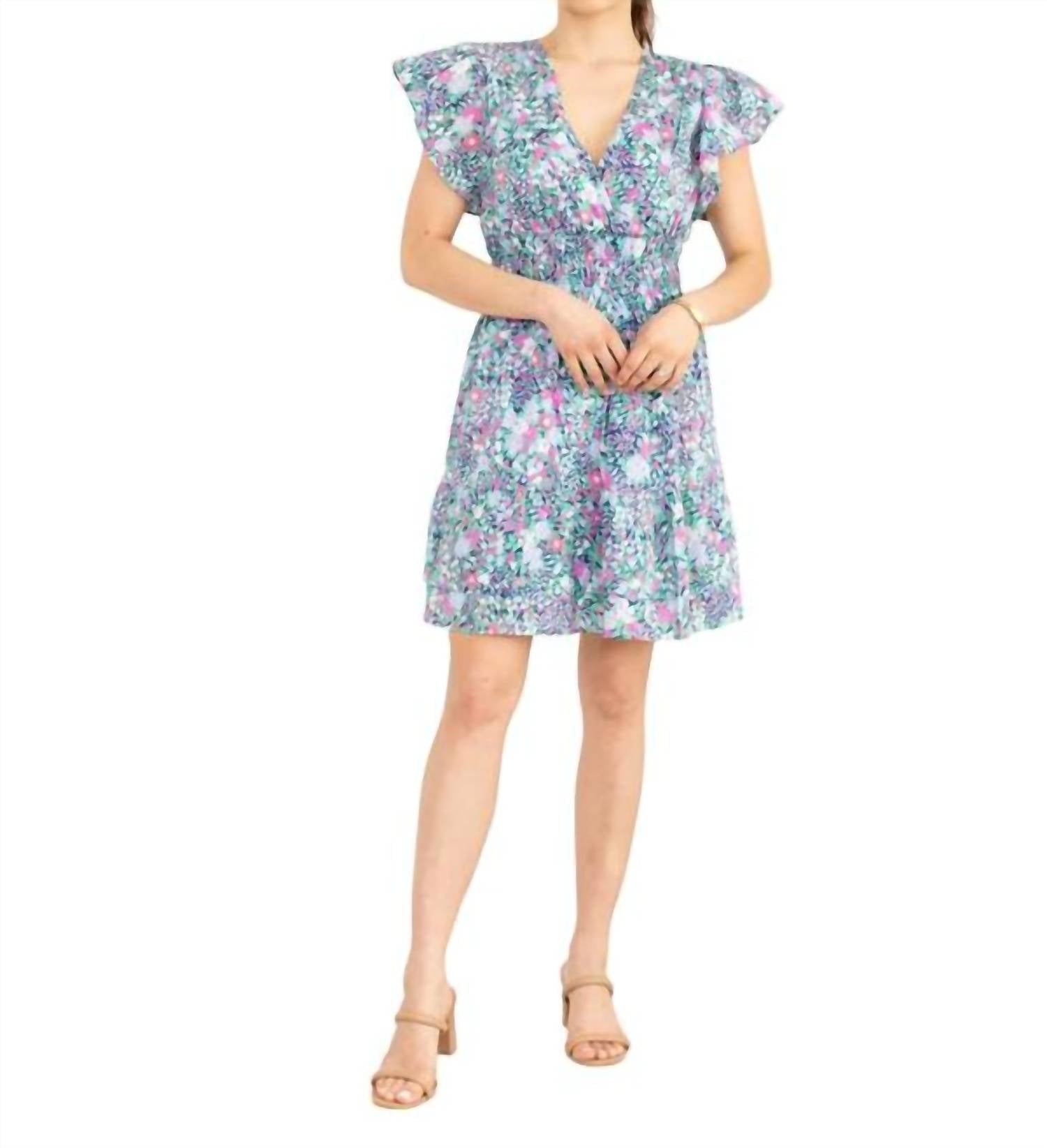 Floral mini dress featuring a V-neckline and flutter sleeves. Open back with a tie closure. Smocked waistband. Hand wash. 100%.Cotton.