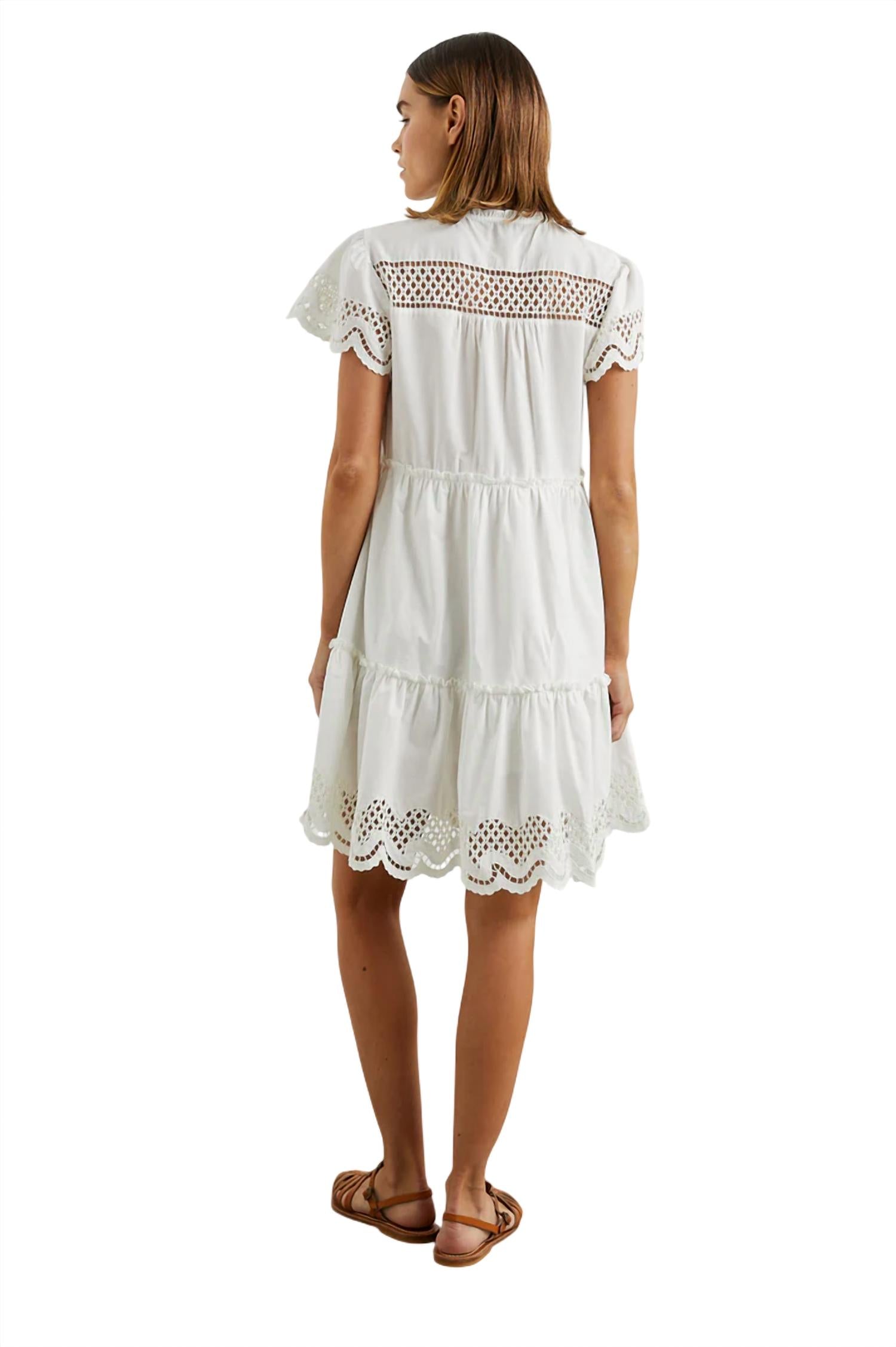 A short and breezy dress for those warmer days. Features a flared tiered skirt. Round neckline with keyhole closure. Scalloped hem and cuffs. 100 % Cotton. Hand wash.