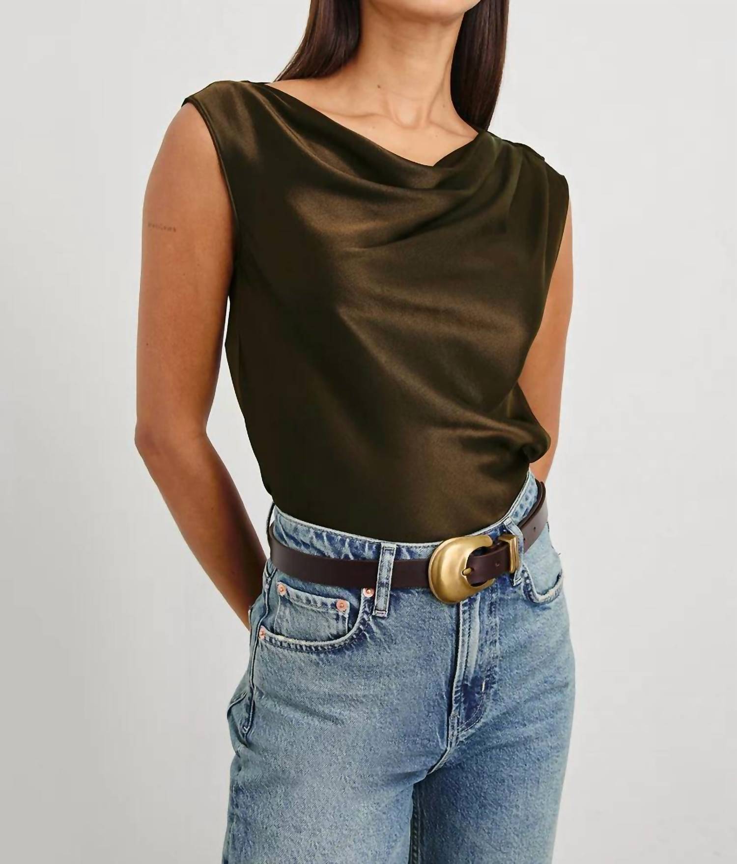 A versatile blouse that works from desk to dinner! Elevate your wardrobe with the Lilly Top by Rails, an embodiment of Quiet Luxury in a sophisticated dark moss hue. This sleeveless blouse is made from a soft, flowing satin back crepe, featuring a chic cowl neckline that's perfect for spring dinner parties. Crafted from 55% Rayon and 45% Viscose, it’s a solid-patterned must-have that pairs seamlessly with your favorite pieces. Closure: Pull on. Care: Dry clean only. Imported.
