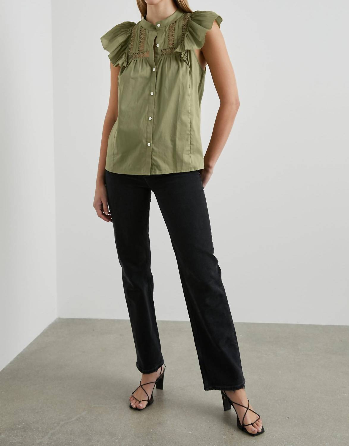 Introducing the Louella Top by Rails, a chic addition to your summer wardrobe in stylish Canteen. This blouse showcases cap sleeves with a square embroidery detail at the chest and a contouring mockneck that exudes femininity. Made from 100% Cotton with a textured pattern, it offers a comfortable fit with a front body length of 24 inches. Closure is secured with buttons, and it is imported and dry clean only.