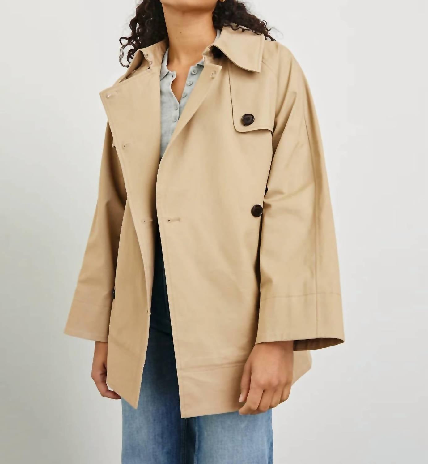 The perfect trench coat that you can throw over any outfit. Discover the Lucien Coat Jacket by Rails, a taupe trench coat that embodies both boldness and timeless elegance. Crafted with 98% Cotton and 2% Spandex, this garment is designed with wide three-quarter length sleeves and contrasting black button closures. This imported piece is completed with an adjustable belt at the waist, offering style and versatility. Perfect for the fall season and engagement occasions, it requires dry clean care.