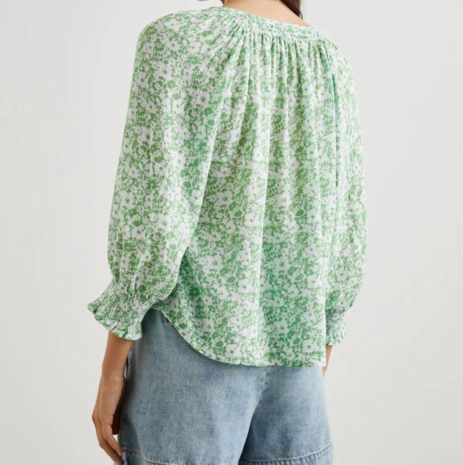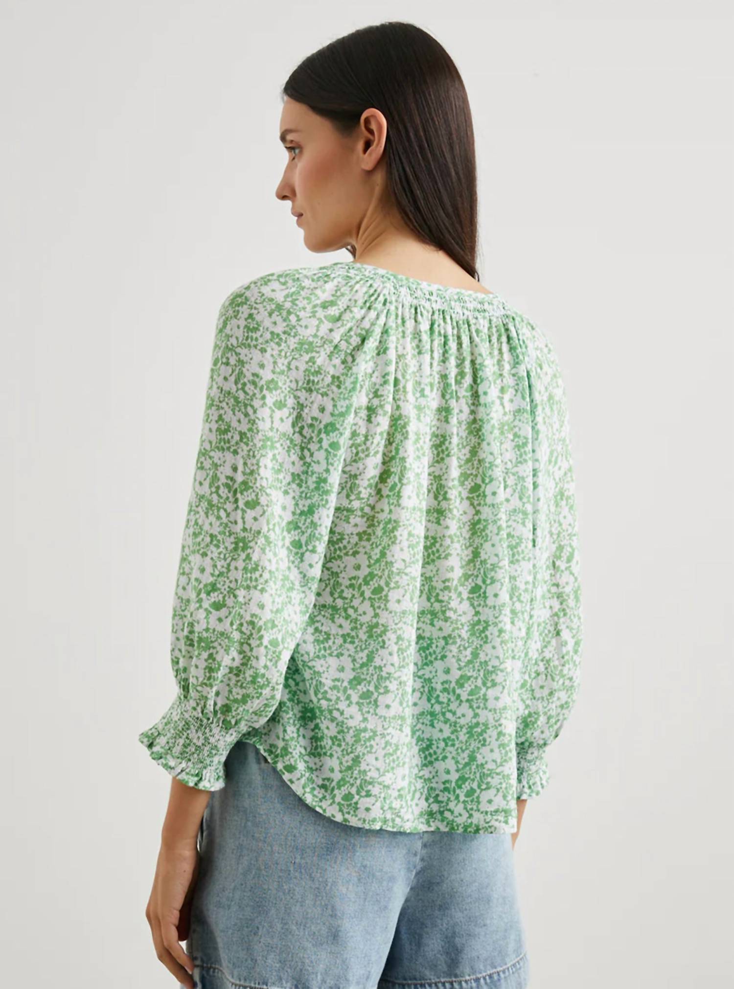 Discover the Mariah Top by Rails, a beautifully crafted piece in a green texture floral pattern that adds charm to any outfit. This long sleeve tee features a comfortable pull-on closure and elegant natural shell buttons for a touch of sophistication. Made from a soft linen blend composed of 55% Linen and 45% Rayon, it offers a relaxed fit with elastic smocked detailing at the cuffs. For care, simply hand wash and line dry.