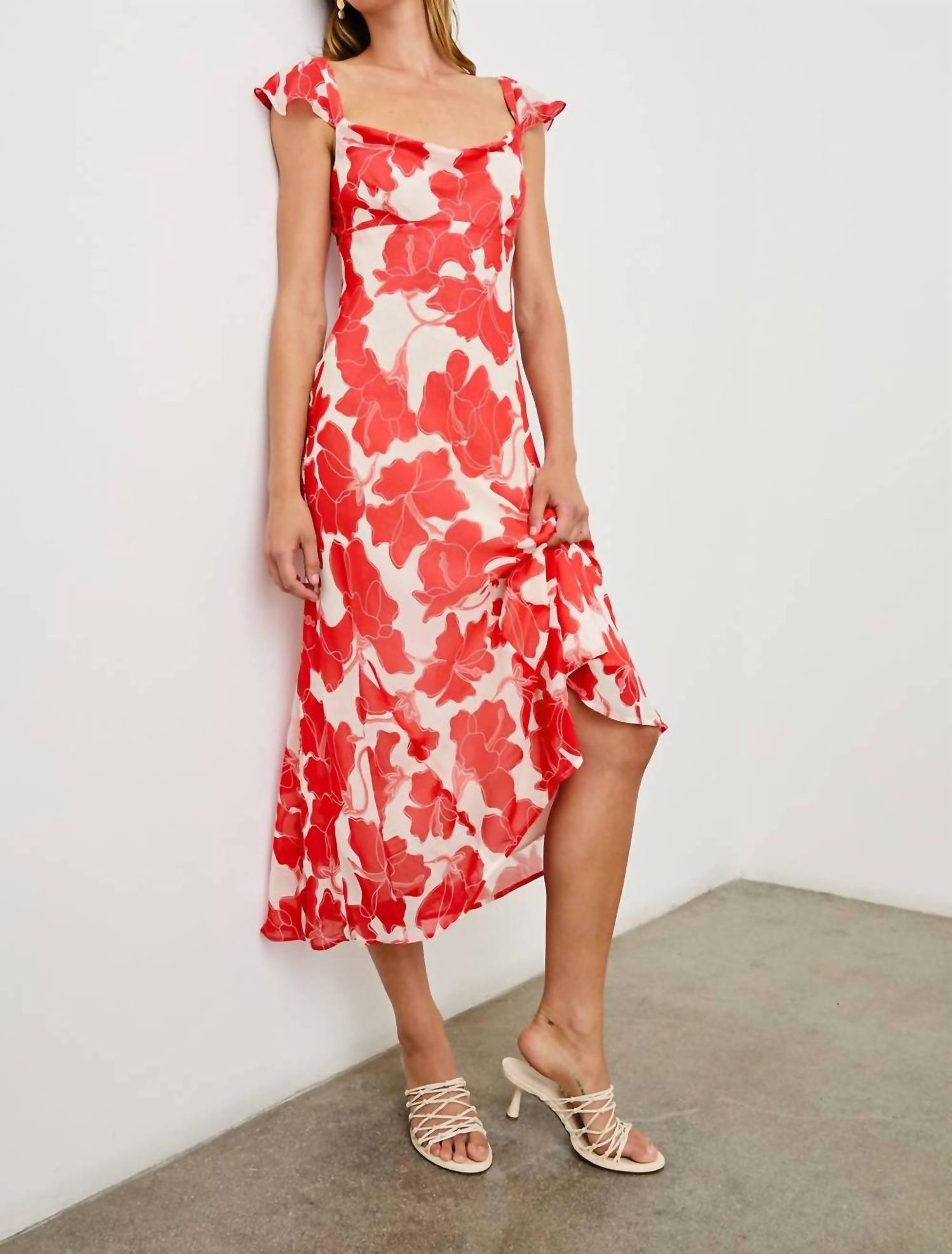 A midi dress so versatile, your options for wearing it are endless. Meet the Marigold Dress by Rails, a stunning choice for your summer wardrobe in Scarlet Hibiscus. This boho chic piece features cap sleeves and a graceful cowl neck, crafted from 100% Viscose for a lightweight feel. The midi A-line silhouette boasts a 46" length, creating an elegant flow that's perfect for vacation getaways. With a flattering pull-on closure and a fitted bodice, it's ideal for any Mother's Day celebration. Care: Dry clean only.