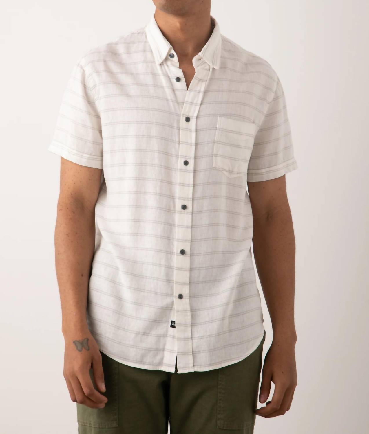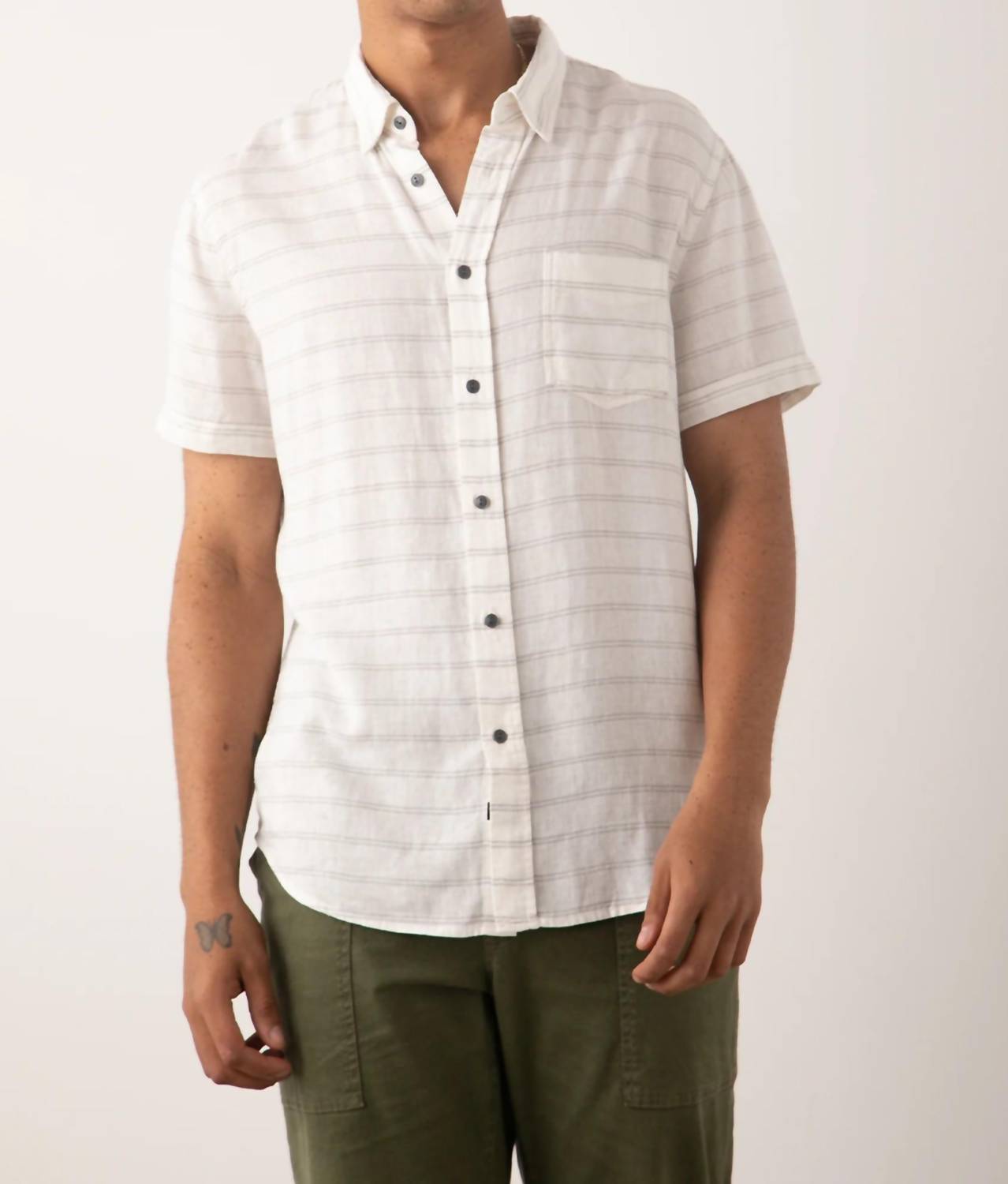 This Carson Shirt features a lightweight, linen blend. Double striped pattern, short sleeve button-down shirt. 55% Linen | 45% Rayon. Machine wash cold, line dry, no bleach, cool iron if necessary.
