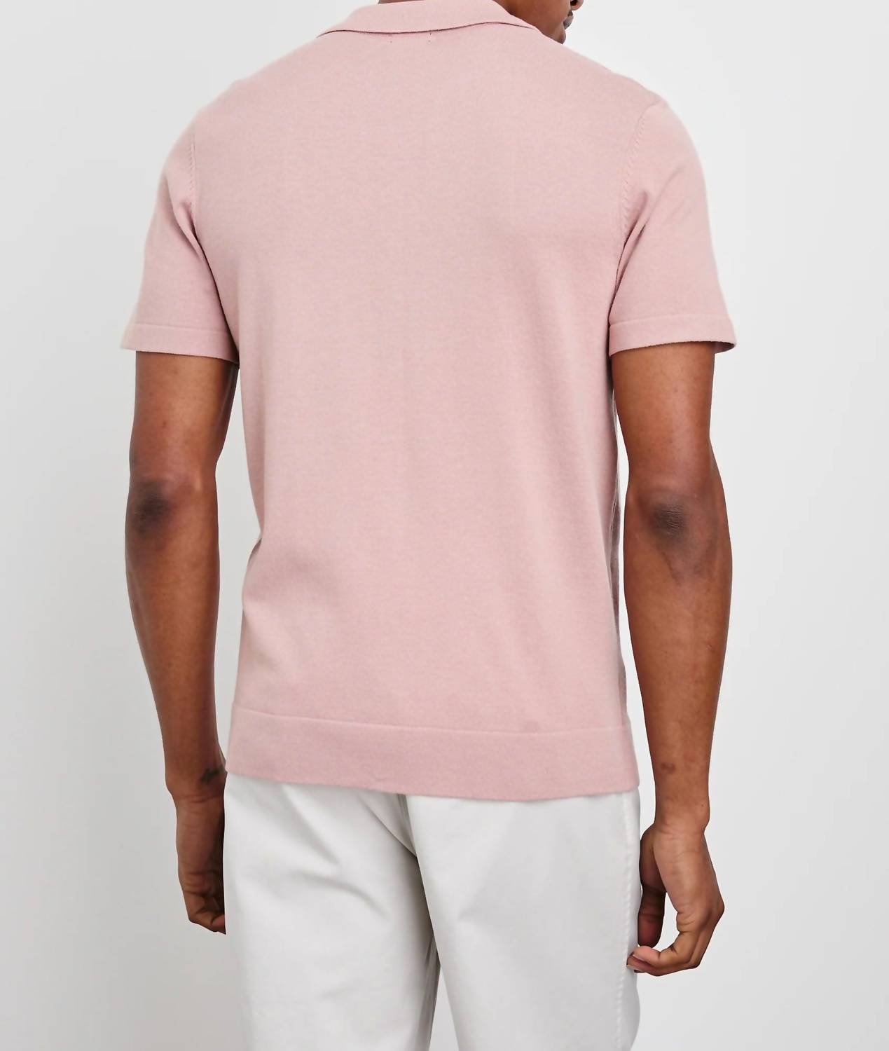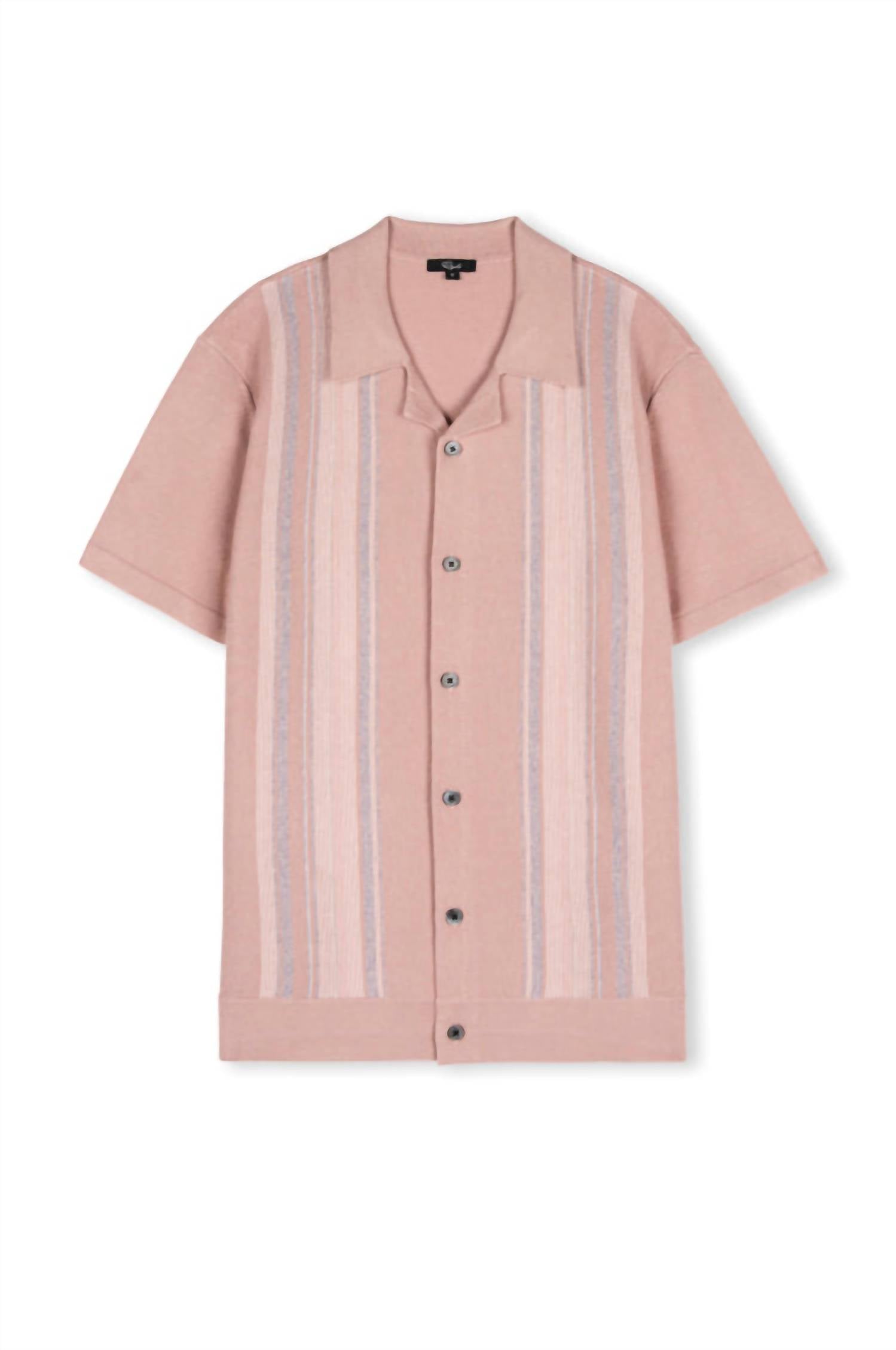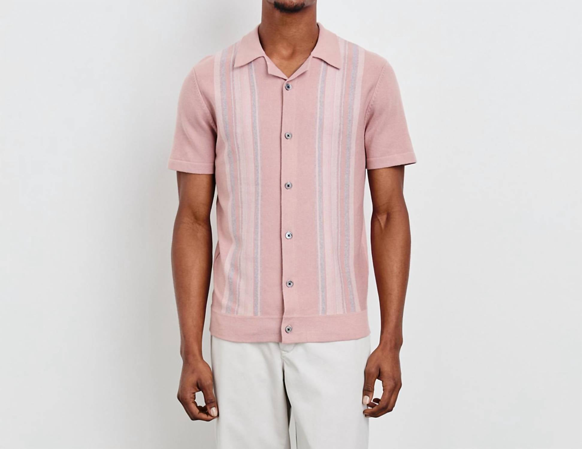 Embrace the spirit of endless California summers with the Men's Silas Knit Sweater Top by Rails. This pink short-sleeve polo, part of the Casual Button Down Shirts collection, is crafted from a comfortable cotton blend, featuring a retro striped pattern and a classic collar neckline. The button closure allows for versatile styling, either open or closed, while the imported design boasts a front body length of 27 1/4" measured from size M. Care for this stylish summer staple by hand washing cold separately and laying it flat to dry; a cool iron can be used if needed.