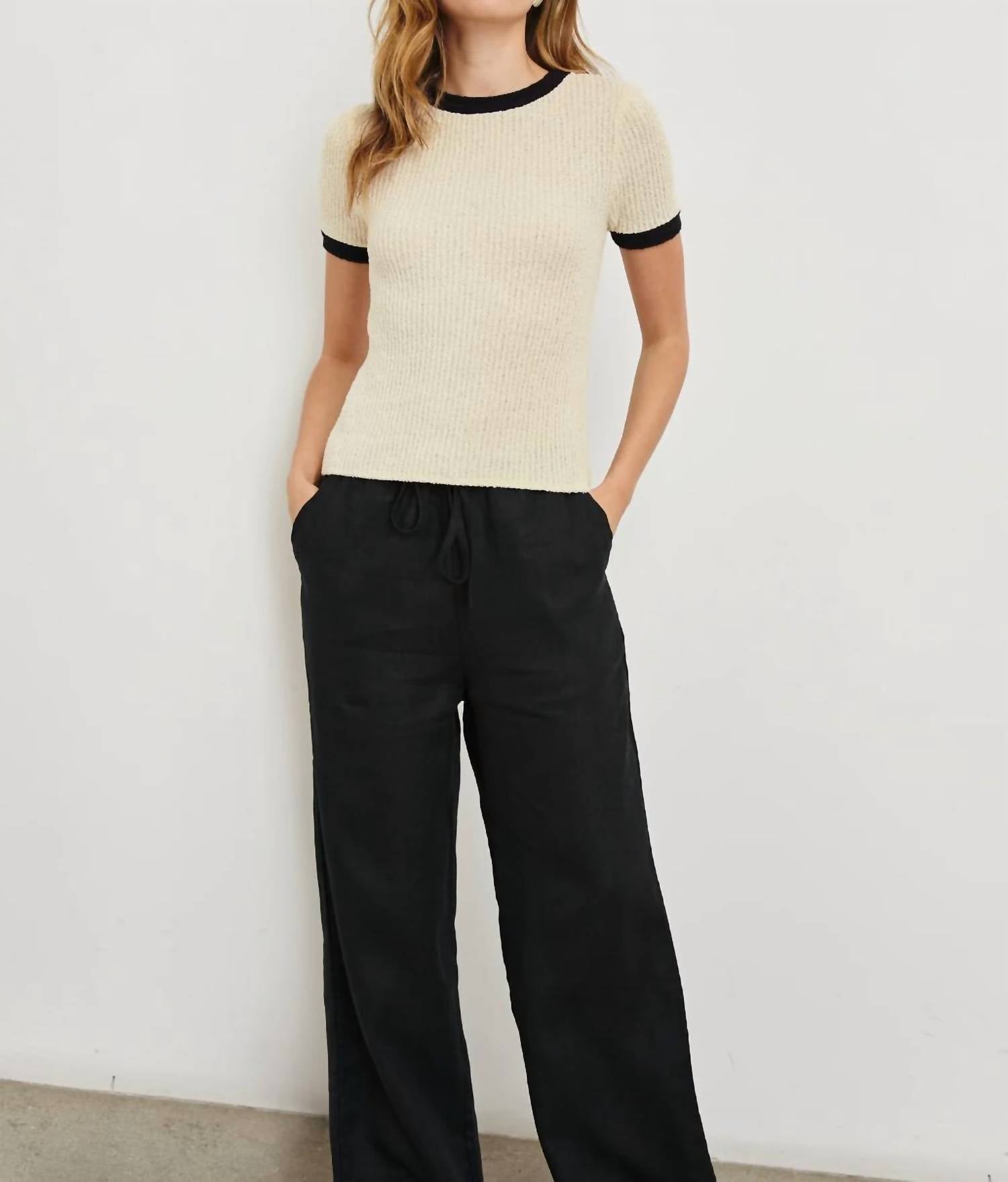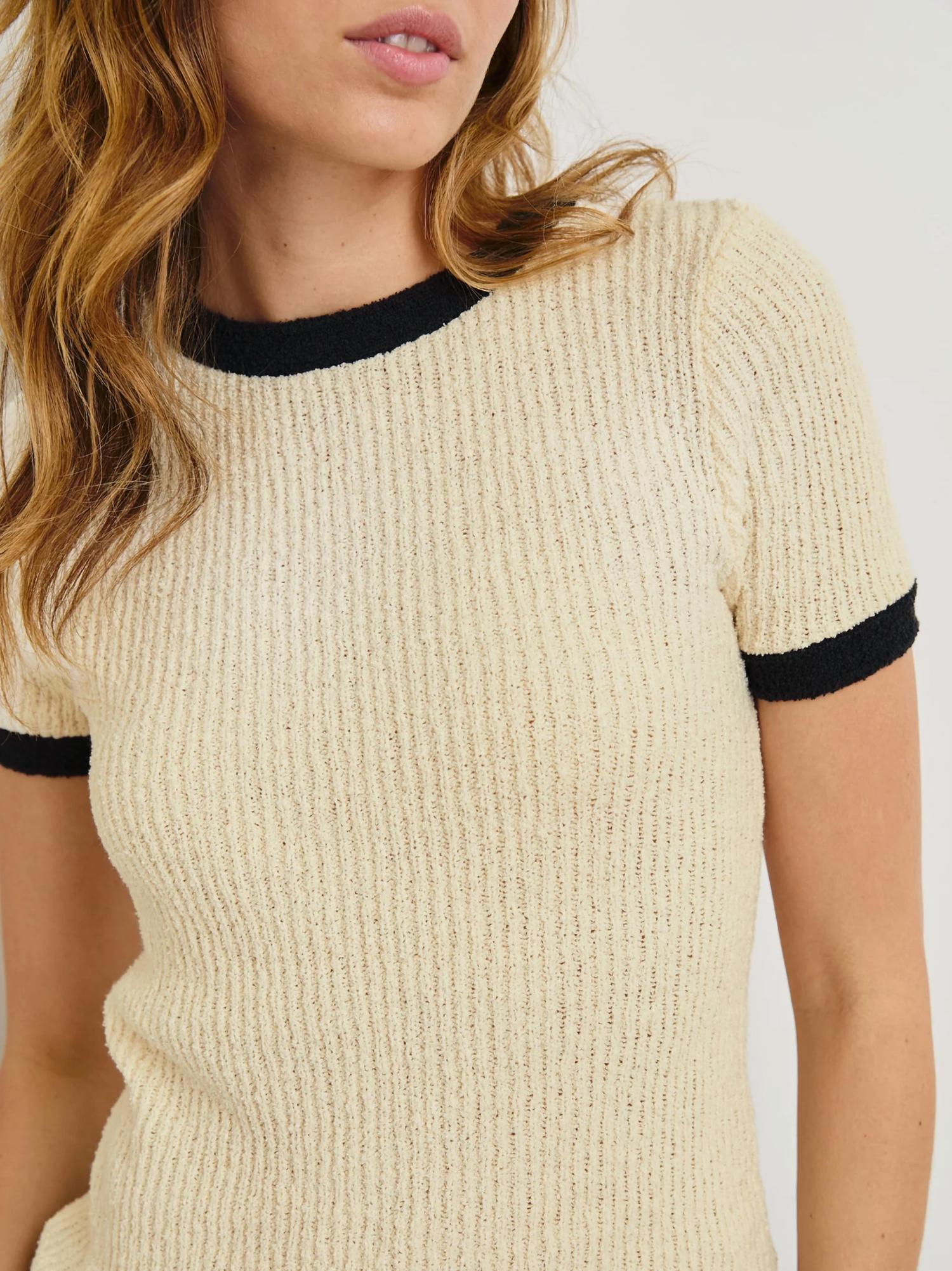 Meet the Meredith Crewneck Tee by Rails, a sophisticated blend of style and comfort in a stunning Ivory Black shade. Featuring a classic crewneck and short sleeves, this fitted tee is beautifully crafted from 78% cotton and 22% Re-Nylon, offering a unique ribbed texture. The pull-on style ensures ease of wear, and the tee measures 20 1/2" in front body length for a perfect fit. Imported and ideal for minimalist aesthetics, care for it by dry cleaning or, alternatively, cool ironing with no bleach.