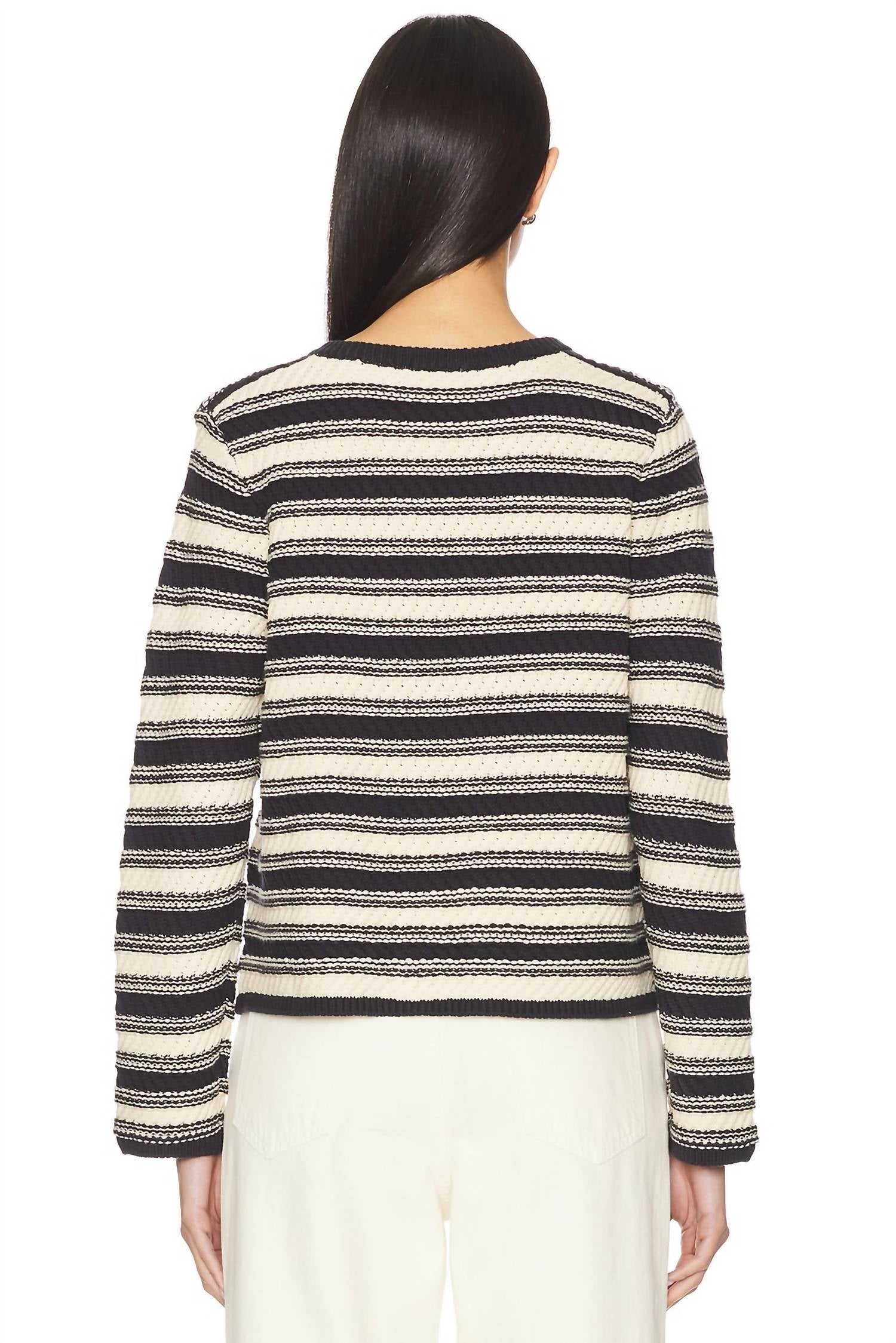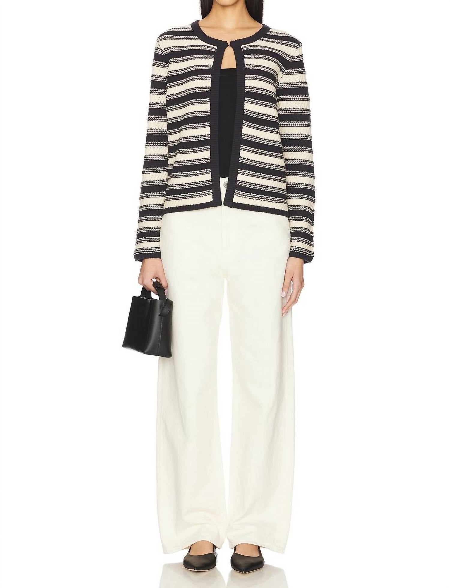 A classic fit that works just as good buttoned as it does left open. Elevate your wardrobe with the Nelly Striped Cardigan by Rails, a luxurious piece crafted for the sophisticated woman. This navy oat stripe cardigan features long sleeves and an open front, designed to drape elegantly with its medium weight knit fabric. Composition: 60% cotton, 40% acrylic. Made in China. Care: Dry clean only. Perfect for travel or Thanksgiving, this preppy piece adds timeless elegance to your fall collection.
