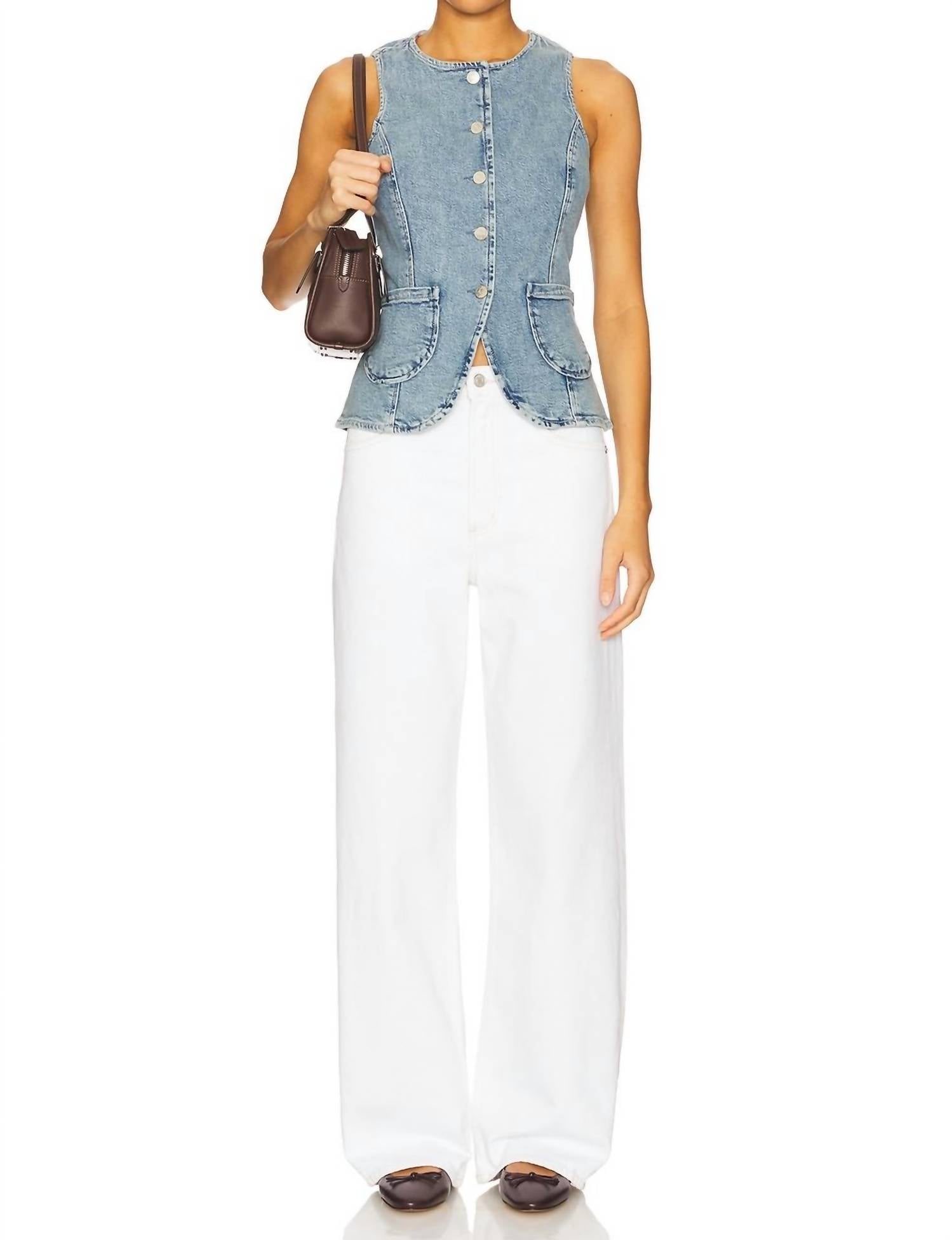 Throw this vest over an all black outfit for a perfectly polished look. Introducing the Portola Vest by Rails, a stylish staple in the Blue Eyed Girl hue. This sleeveless vest features a fitted silhouette with classic front button closures and practical lower patch pockets. Made from 100% cotton, it showcases medium weight denim sourced from Türkiye. Easy to care for, this piece is machine washable.