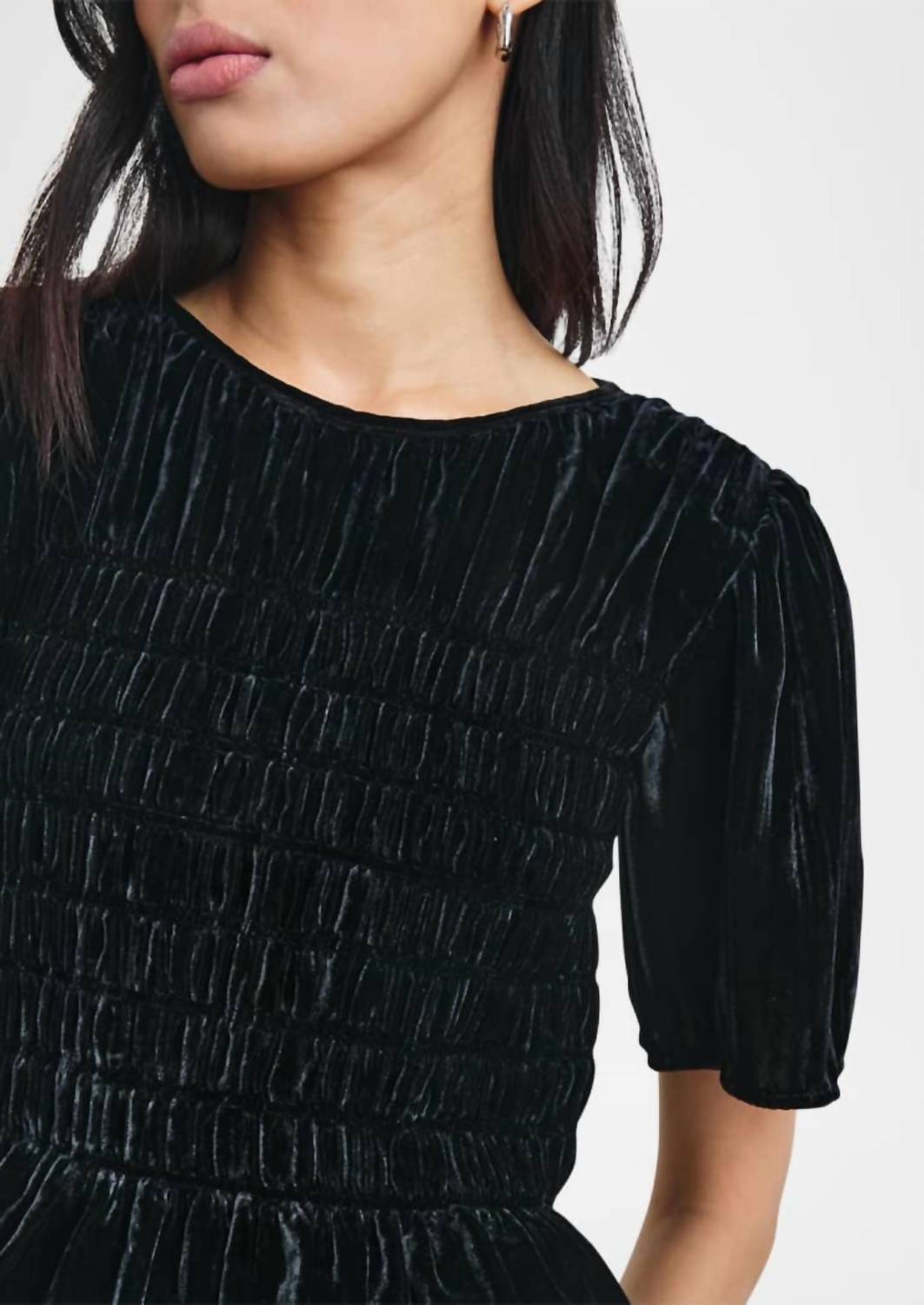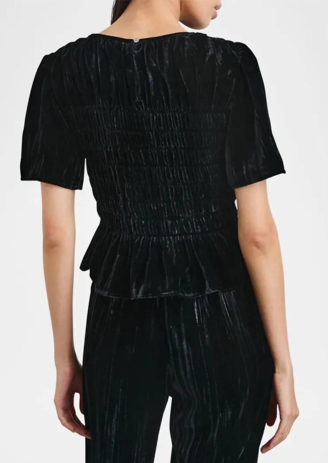 The short sleeve tee you'll want in every color. Introducing the Rosie Top by Rails, a perfect blend of elegance and comfort for your evening ensembles. This black velvet shirt features a wide short sleeve with intricate smocked detailing, complemented by ruffling along the bottom. Composition: 75% Viscose, 25% Nylon, offering a luxurious crinkle texture with natural drape. Length: 20 1/4" from the front body (measured from Small). Origin: Imported. Care: Dry clean only. Pair it with jeans for a casual look or elevate it with the Brissa Pant for a sophisticated winter outfit.