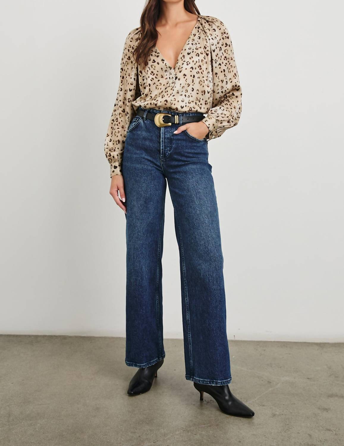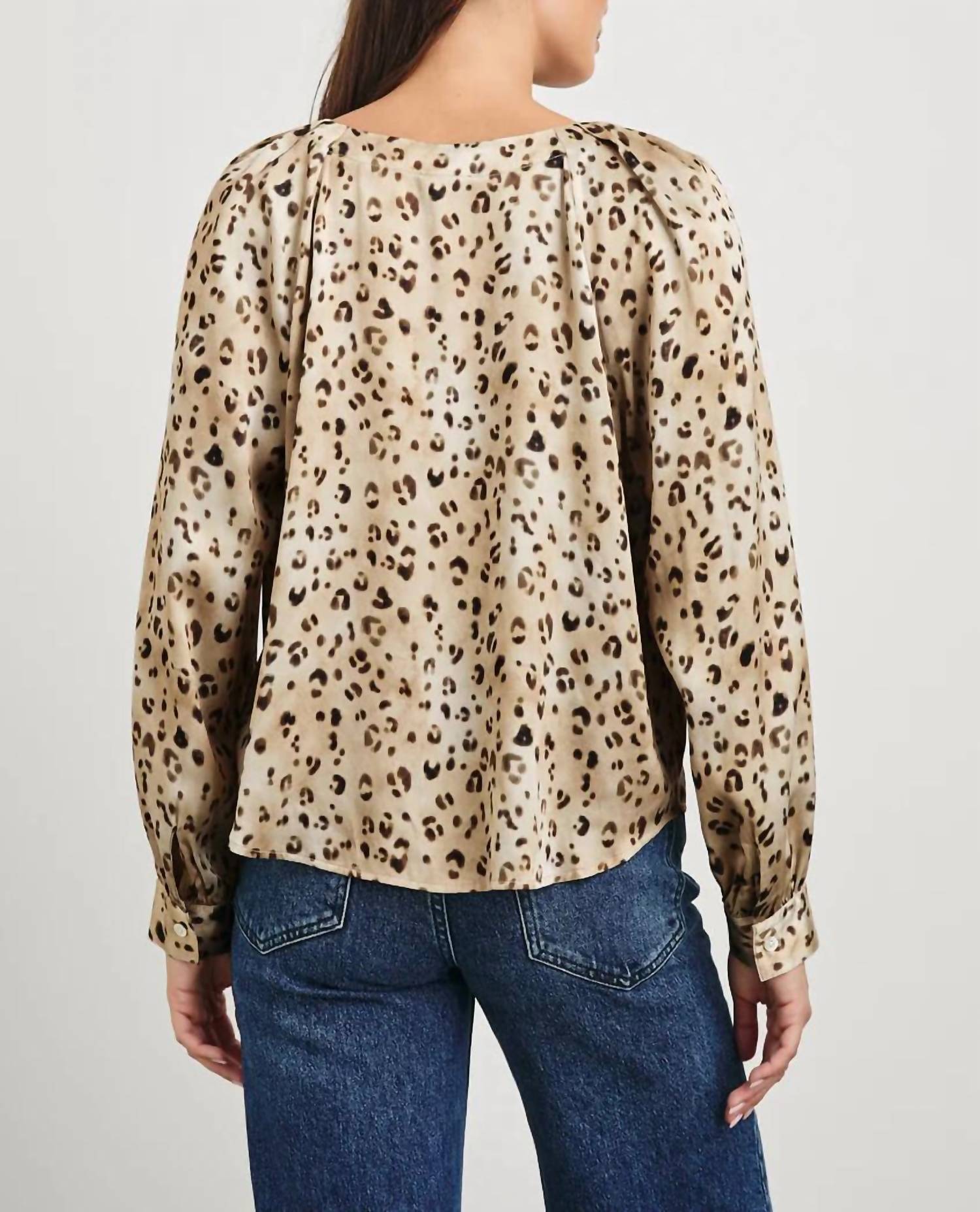 A timeless blouse that will never go out of style. Unleash your inner spirit with the Sandra V Neck Shirt by Rails, a stunning addition in Champagne Leopard designed to complement every silhouette. This long sleeve blouse boasts a smooth satin crepe fabric with a subtle peplum sleeve and a flattering faux wrap style. Composition: 55% Rayon, 45% Viscose. Garment length: Front Body Length is 24" (Measured from Small). Care: Dry clean only.