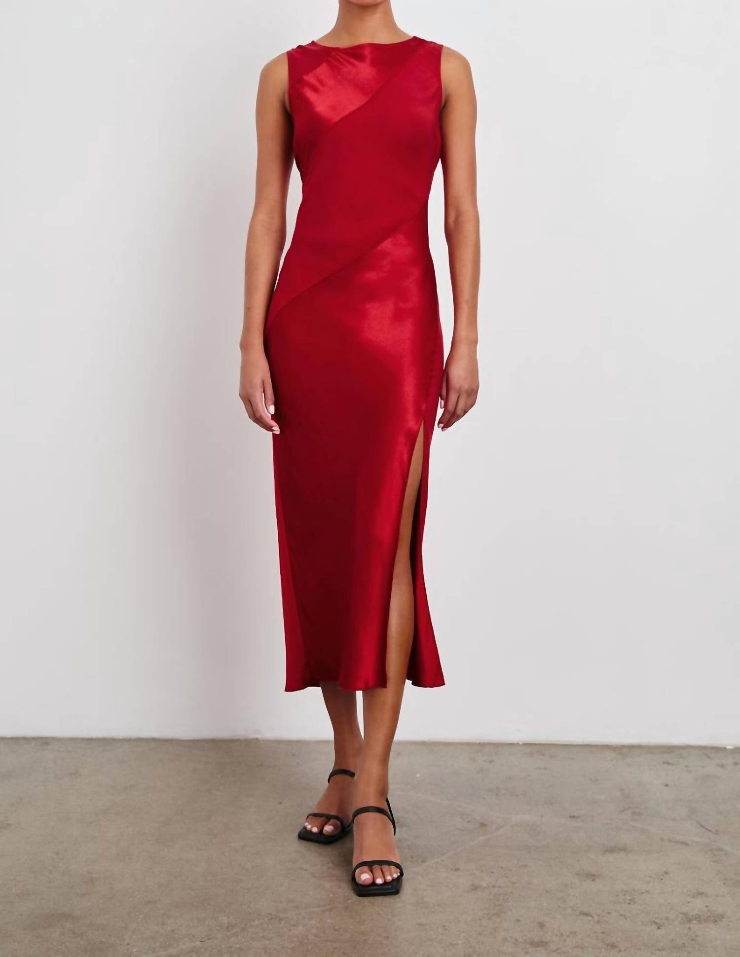 A midi dress so versatile, your options for wearing it are endless. Experience elegance with the Sanya Dress by Rails, a striking choice in scarlet for any evening event. This sleeveless midi dress is crafted from a luxurious blend of 55% Rayon and 45% Viscose, boasting a lustrous satin crepe finish and a sophisticated boatneck. With its bias-cut design and a stylish front thigh slit, it features contrasting matte diagonal panels that enhance its monochrome appeal. Closure is pull-on for ease, and it’s best maintained with dry cleaning, adding appeal to any Valentine's Day or summer occasion.