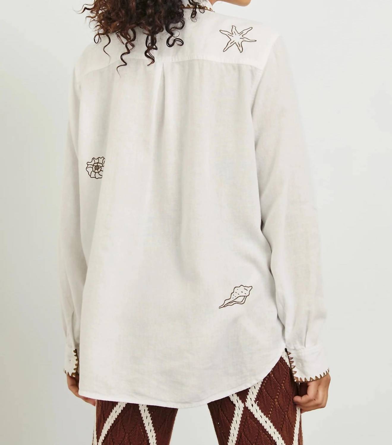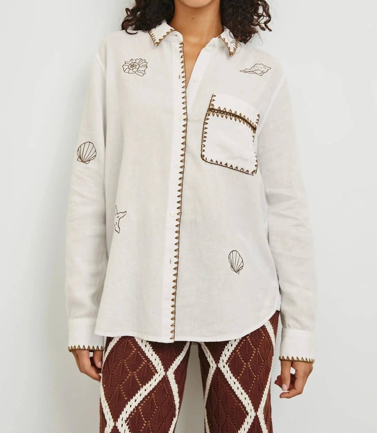 Introducing the Saya Marine Embroidery Button-down by Rails, a standout piece combining style and sustainability. This long sleeve button-down shirt is expertly crafted from a luxe blend of 55% linen and 45% rayon, offering a relaxed, roomy fit with elegant specialty embroidery and a distinctive blanket finishing stitch. With a front body length of 26 1/2 inches, it beautifully complements any wardrobe. Care for it by hand washing cold and line drying to maintain its superior quality. Ideal for a beach day or workwear, this white shirt embraces eco-friendly fashion with its thoughtful construction.