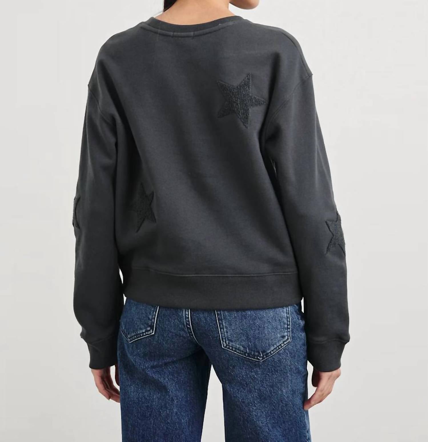 Great fit, cute design, soft fabric. You'll love everything about this long sleeve tee. Discover the Sonia Top by Rails, a perfect blend of comfort and style in washed black. This long sleeve tee is crafted from 100% cotton fleece, featuring a wide crewneck and charcoal patch stars for a textured finish. Imported for quality, this piece is designed to run true to size with a front body length of 22 1/2" (measured from small). Care for it with a gentle hand wash in cold water for lasting wear.