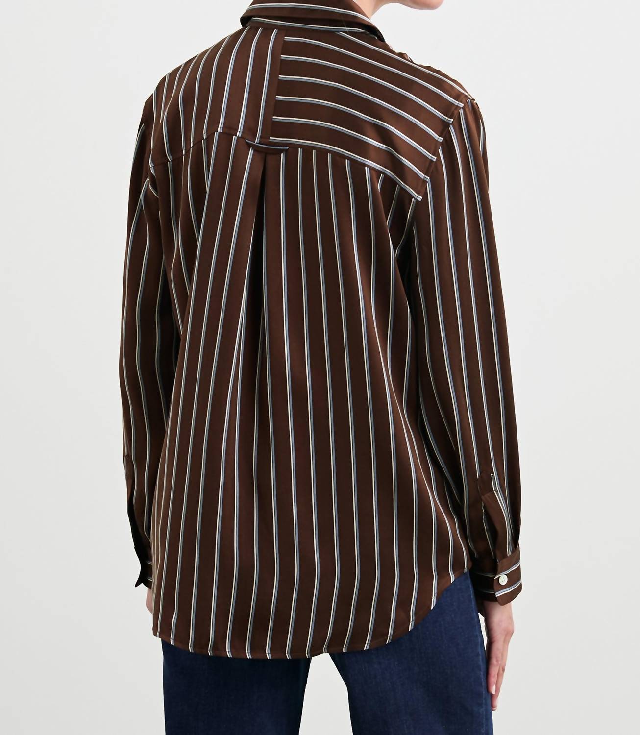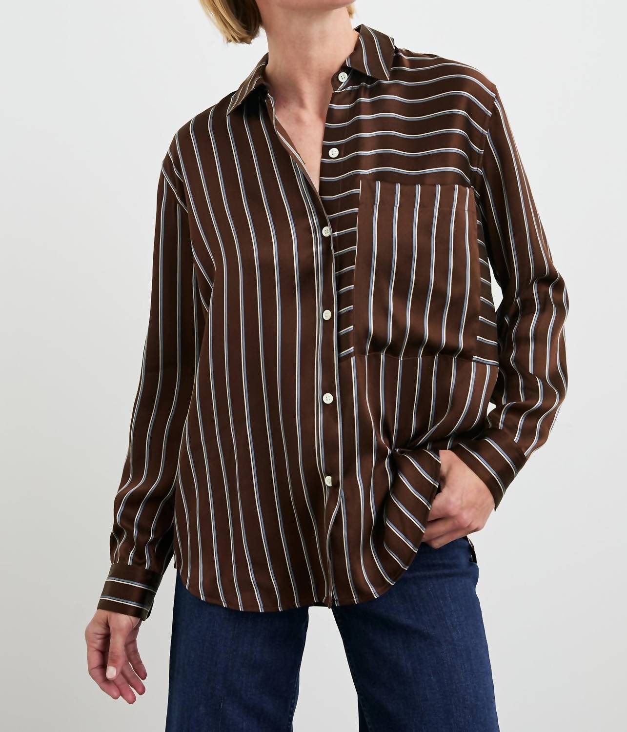 Perfectly tailored and soft to the touch. Elevate your wardrobe with the Spencer Button Front Long Sleeve Top by Rails, featuring a chic Baltic Stripe pattern. Crafted from 100% silk charmeuse, this elegant garment offers both style and comfort with its relaxed and flattering longer length. Enhancing its practicality, the Spencer includes an oversized patch pocket and a sophisticated collar neckline. Closure: Pull-on style. Care: Dry clean only. The front body length measures 27 inches, providing a tailored fit that remains true to size.