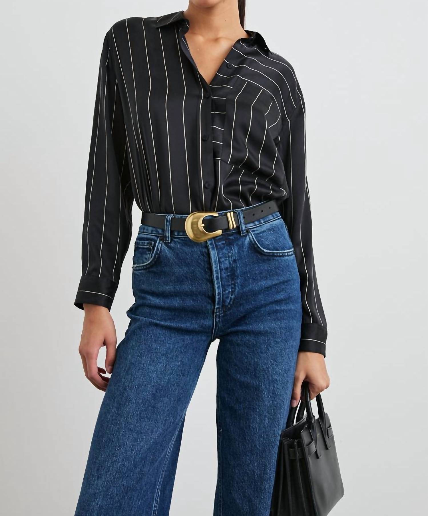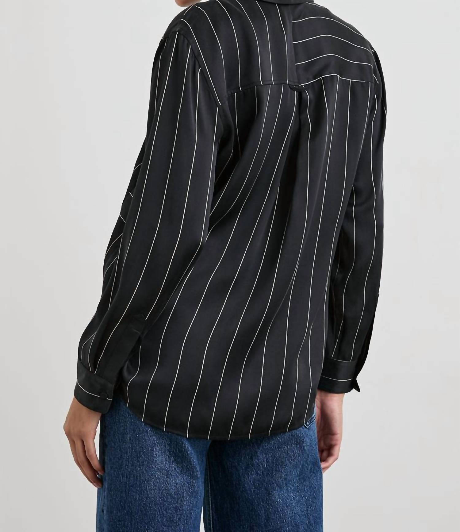 Perfectly tailored and soft to the touch. This button-down shirt features long sleeves and a front body length of 27", designed with vertical stripes and a contrasting oversized patch pocket for a modern twist. Crafted from 100% silk charmeuse, its smooth texture ensures year-round wearability while maintaining timeless elegance. Originating from an imported collection, it requires dry clean care to preserve its luxurious feel. Button closure.