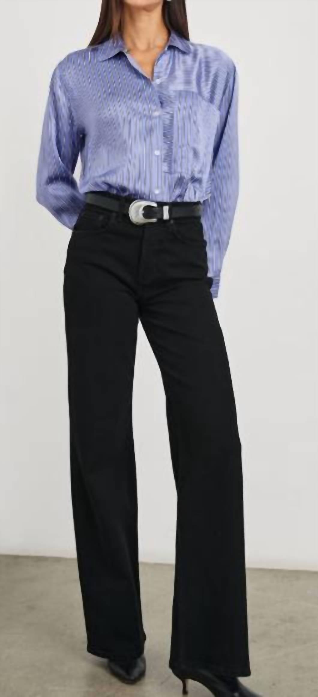 Unique buttondown shirt featuring luxe fabric for a polished finish. Made from super smooth silk charmeuse this green collared buttondown shirt features vertical stripes, relaxed fit, oversized patch pocket at chest, and longer length. True to size. Front Body Length: 27" (Measured from Small). Dry clean only. 100% Silk.