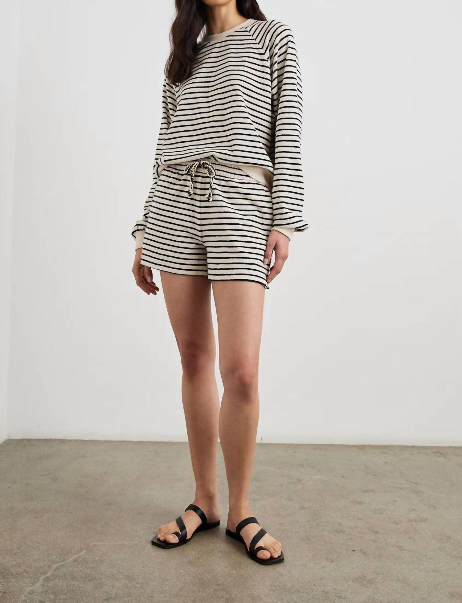 High-waist is here to stay and we especially love this style short. Discover the Teddy Short by Rails, a high-rise fit designed for stylish outdoor adventures in Sailor Stripe Terry Towel. Made from 100% Cotton, this nautical-inspired piece features a shorter inseam of 3 5/8" and a drawstring tie closure for an adjustable fit. Crafted for optimal comfort, it is imported and includes pockets for added functionality. To maintain its quality, hand wash cold, lay flat to dry, and cool iron if necessary.