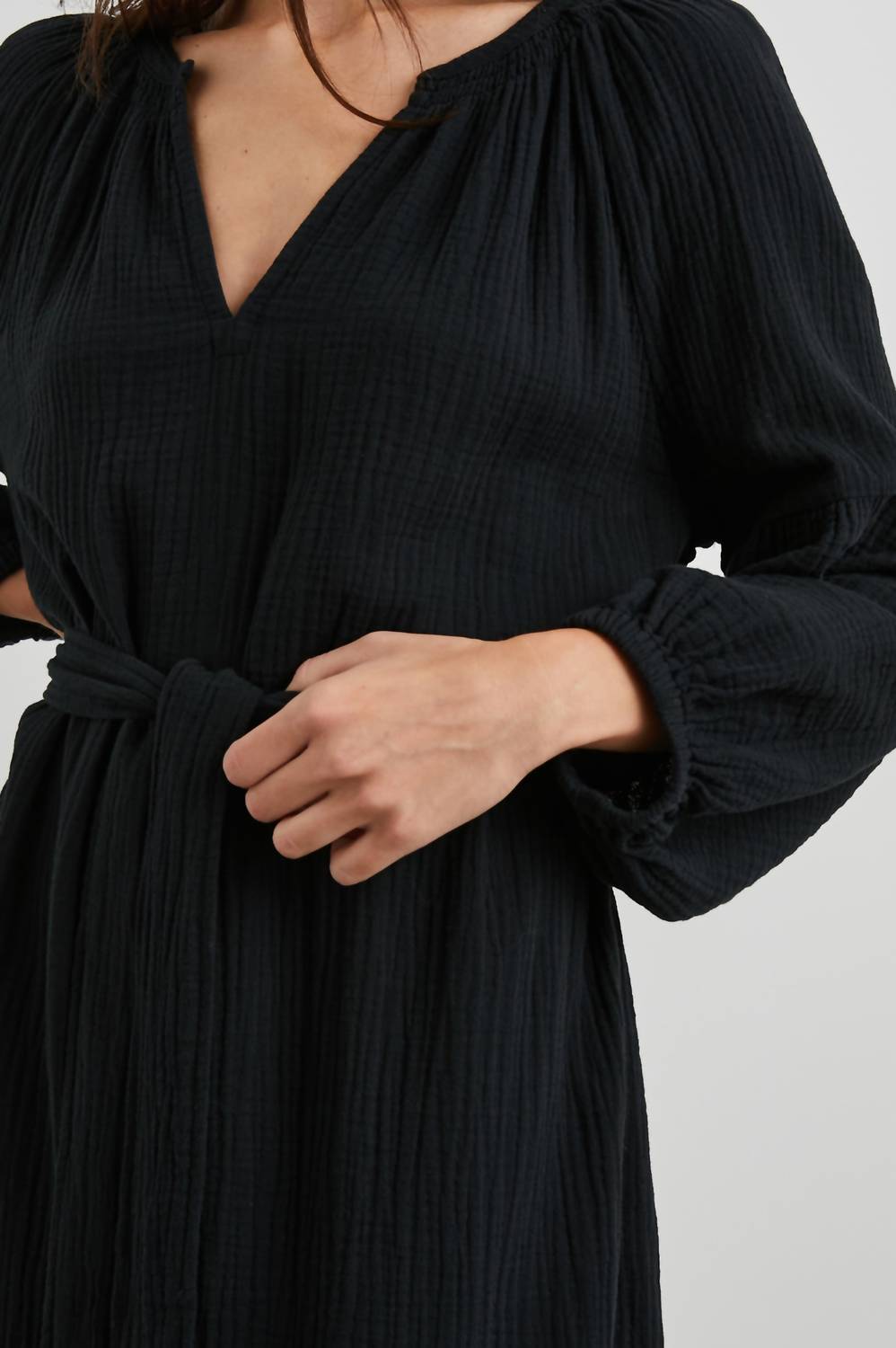 Introducing the Vittoria Dress by Rails, an effortlessly chic little black dress that makes a statement. Crafted from 100% organic cotton, this midi-length piece features a textured design and relaxed three-quarter sleeves for a sophisticated look. The pull-on closure, v-neckline, and contouring waist belt enhance its flattering A-line silhouette. Imported with care instructions: hand wash cold and hang dry, avoiding bleach and using a cool iron if necessary.