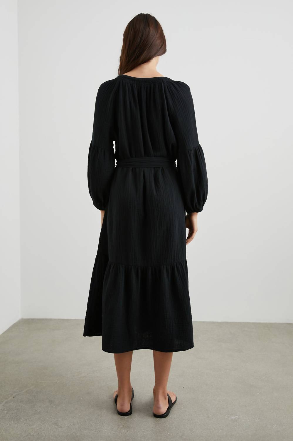 Just add slides or mules and you are good to go. Introducing the Vittoria Dress by Rails, an effortlessly chic little black dress that makes a statement. Crafted from 100% organic cotton, this midi-length piece features a textured design and relaxed three-quarter sleeves for a sophisticated look. The pull-on closure, v-neckline, and contouring waist belt enhance its flattering A-line silhouette. Imported with care instructions: hand wash cold and hang dry, avoiding bleach and using a cool iron if necessary.