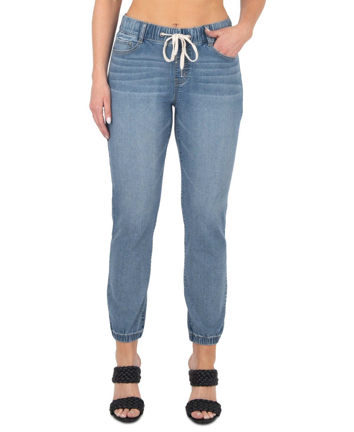 Pull on cool| comfy style with these denim jogger pants from Rewash.| Approx. inseam; 27| Front rise; approx. 9-3/4; back rise; approx. 15-1/4; relaxed leg opening; 10 extends to 13-1/2 | Pull-on style with front tie| Cuffed hems| Cotton/polyester/rayon/spandex