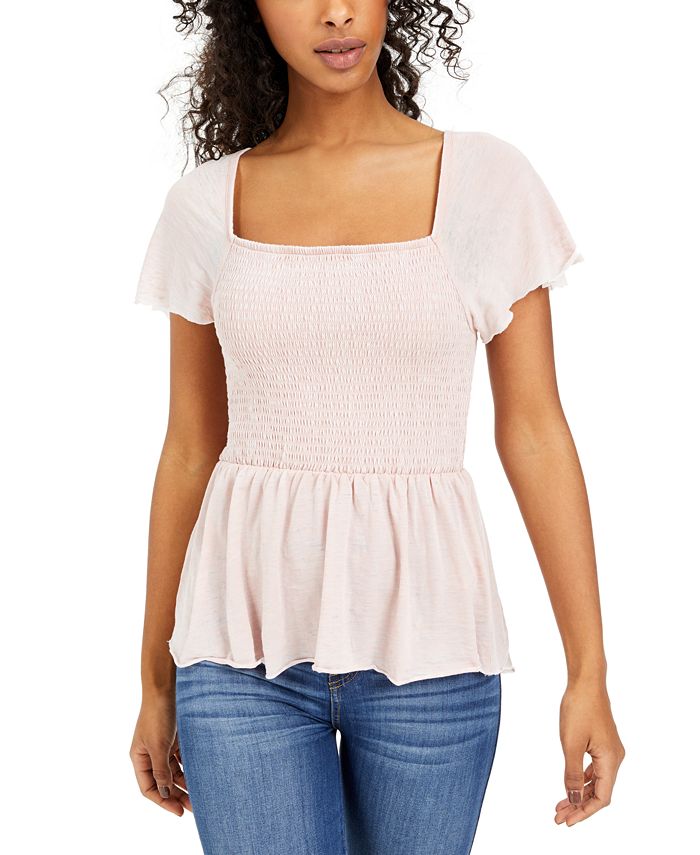 Go a little boho in this smocked top from Rewash| designed with a flowy high-low hem and a tie strap at the back.| Square neckline; tie strap at back| Smocked bodice; raw trim at cuffs and hem; high-low hem| Flutter sleeves| Runs small