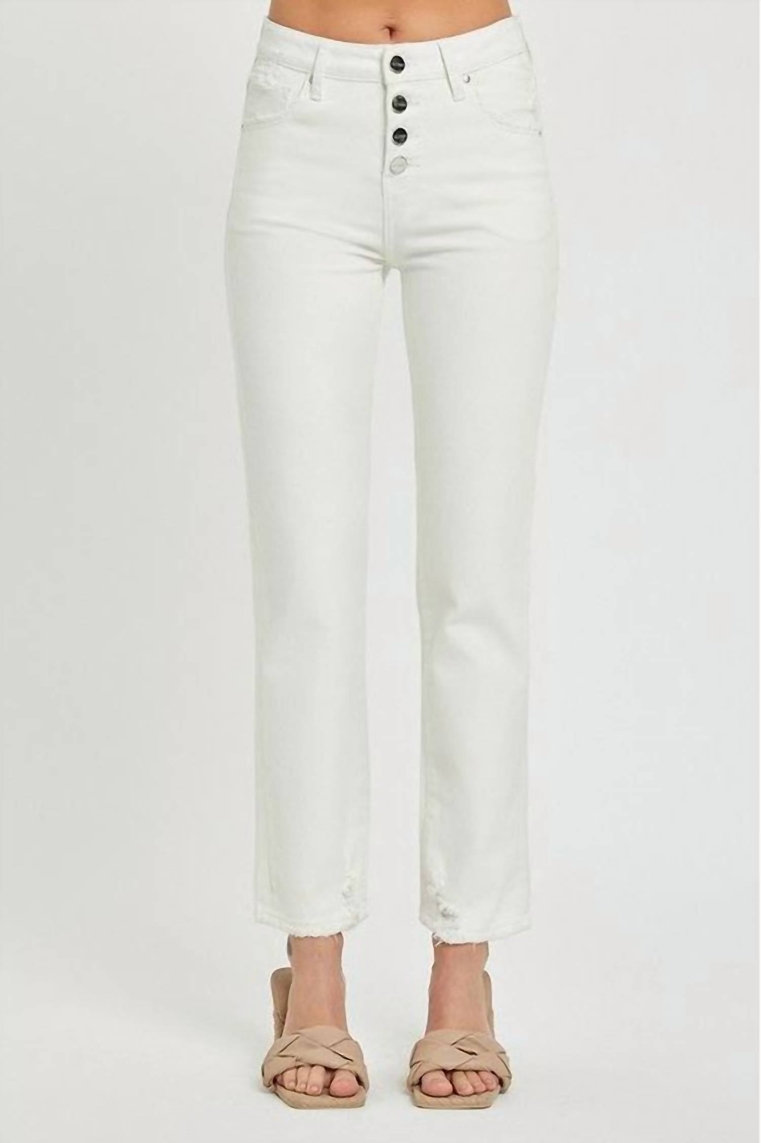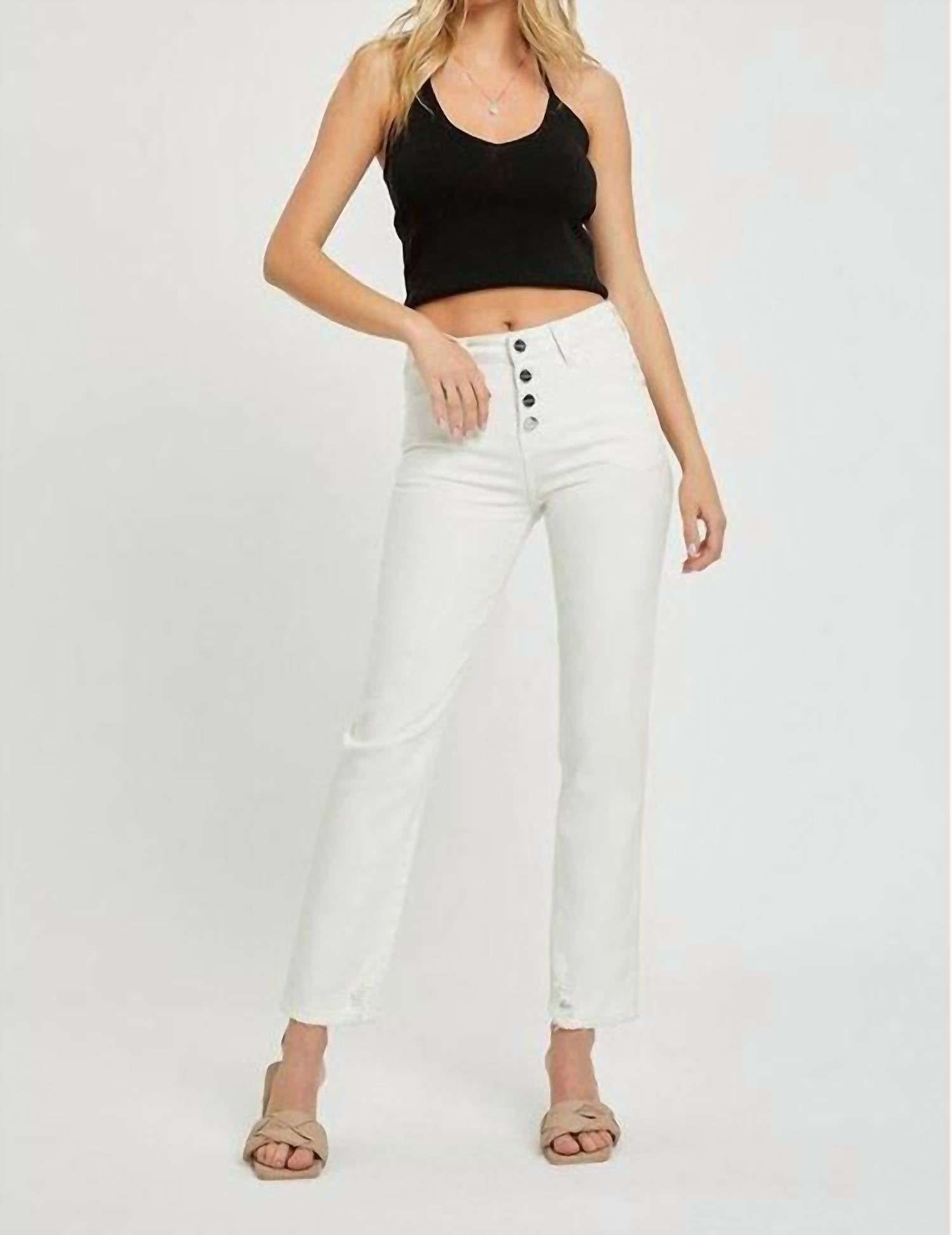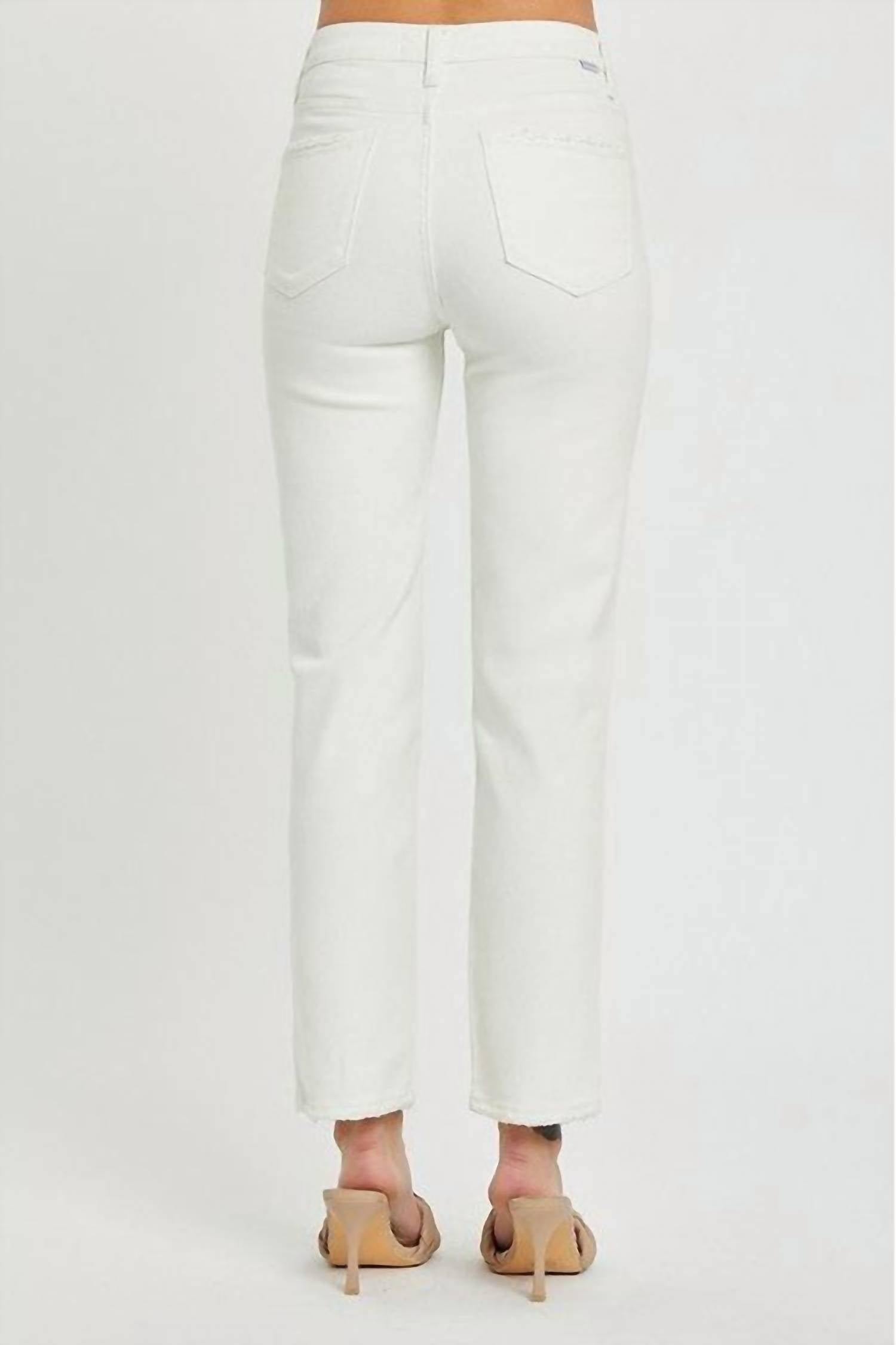 This straightleg pant is both stylish and comfortable. Did we mention the fit is perfection? Introducing the Mid-Rise Tummy Control Tapered Pant by RISEN, designed for women seeking both style and comfort. These white pants feature a mid-rise 9.5" waist and a 27" inseam, ensuring a flattering fit. Made from 98% Cotton and 2% Elastane, its tapered leg and solid pattern allow for versatile wear. With a functional pocket design and a stylish button closure, it’s recommended to size up for the best fit.