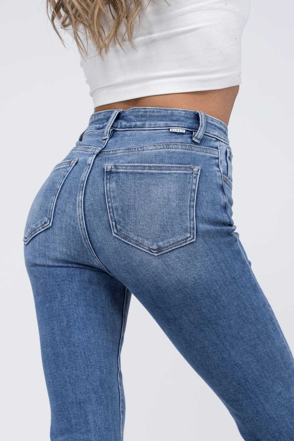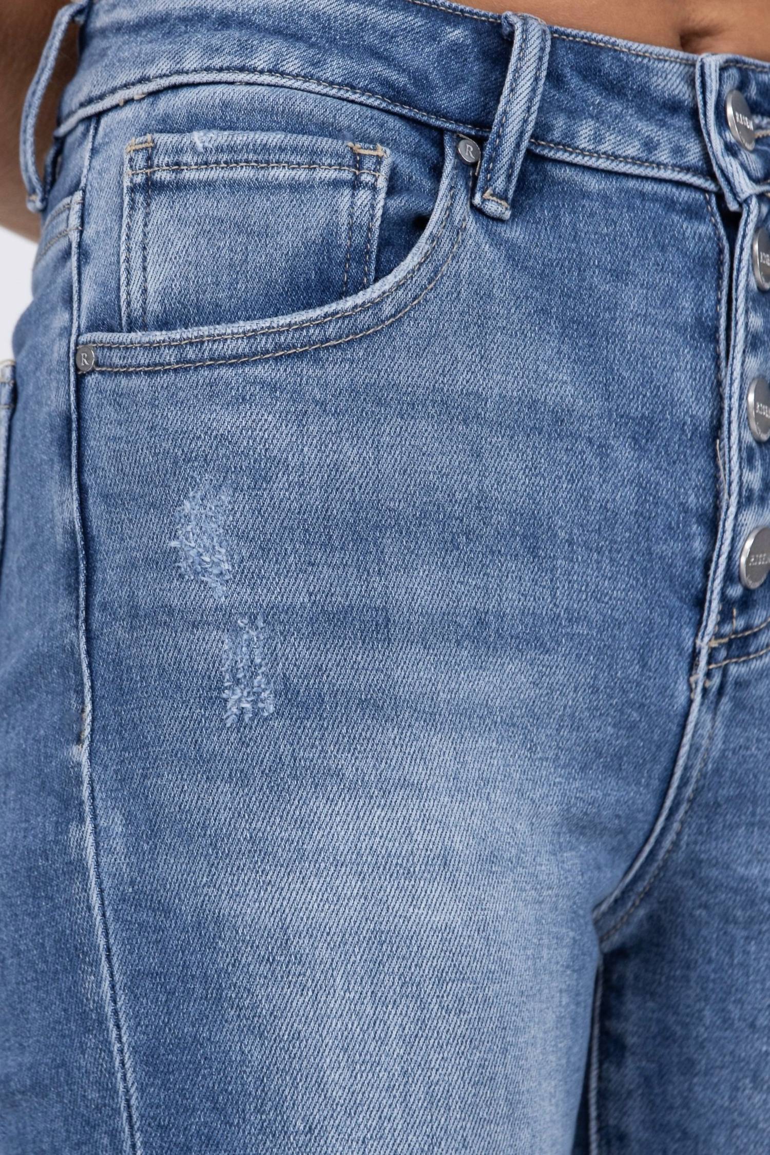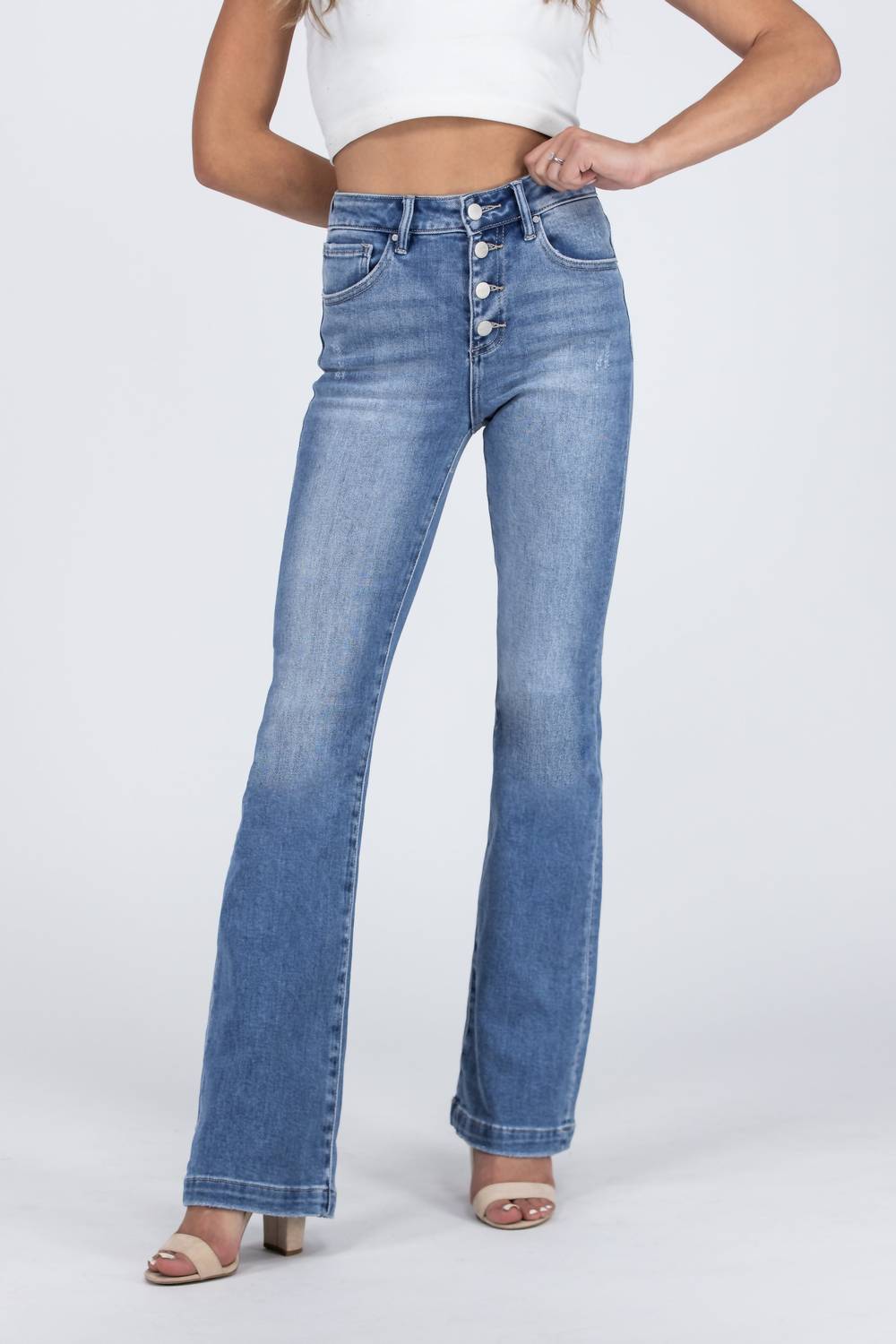 Introducing the Misunderstood High-Rise Button Down Bootcut Denim Jeans by RISEN, a must-have for those looking to make a statement in style. Crafted from a comfortable cotton blend (93% Cotton, 5% Polyester, 2% Spandex), these light wash jeans feature subtle distressing and trendy whiskering. Designed with a high-rise fit, the inseam measures 34" for size 5, and they showcase a stylish bootcut leg. The button closure adds a touch of classic elegance, perfect for any casual outing.