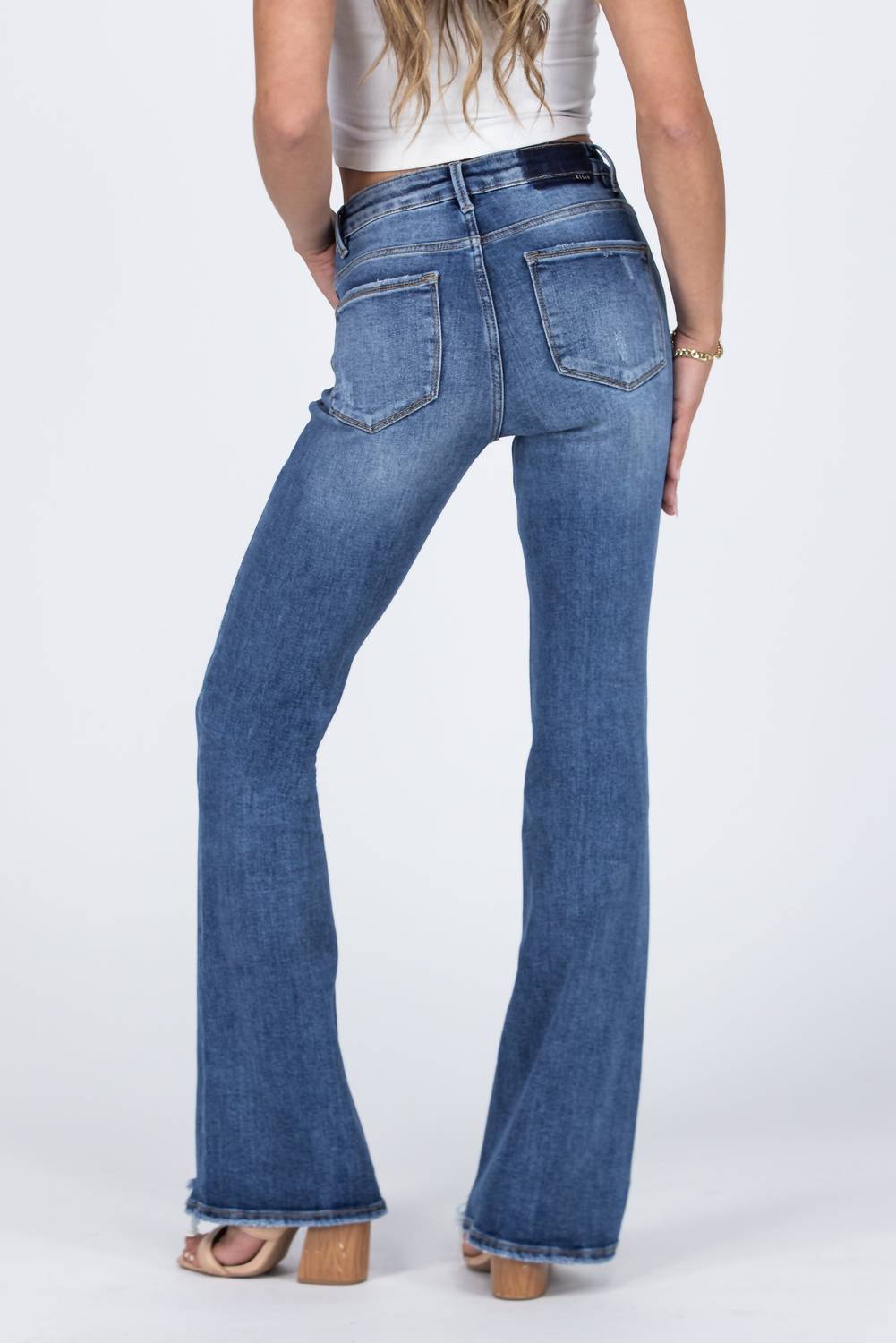 Elevate your denim collection with the Must Have You High-Rise Tummy Control Flare Denim Jeans by RISEN in a sophisticated dark wash. These jeans feature a high rise and a relaxed fit that accentuate curves, with whiskering, distressed pockets, and a frayed step hem for added edge. Made from a comfortable cotton blend (93% Cotton, 5% Polyester, 2% Spandex) and featuring a button closure, this pair boasts a generous 34" inseam. Perfect for pairing with your favorite tops, they add a touch of style to any casual ensemble.