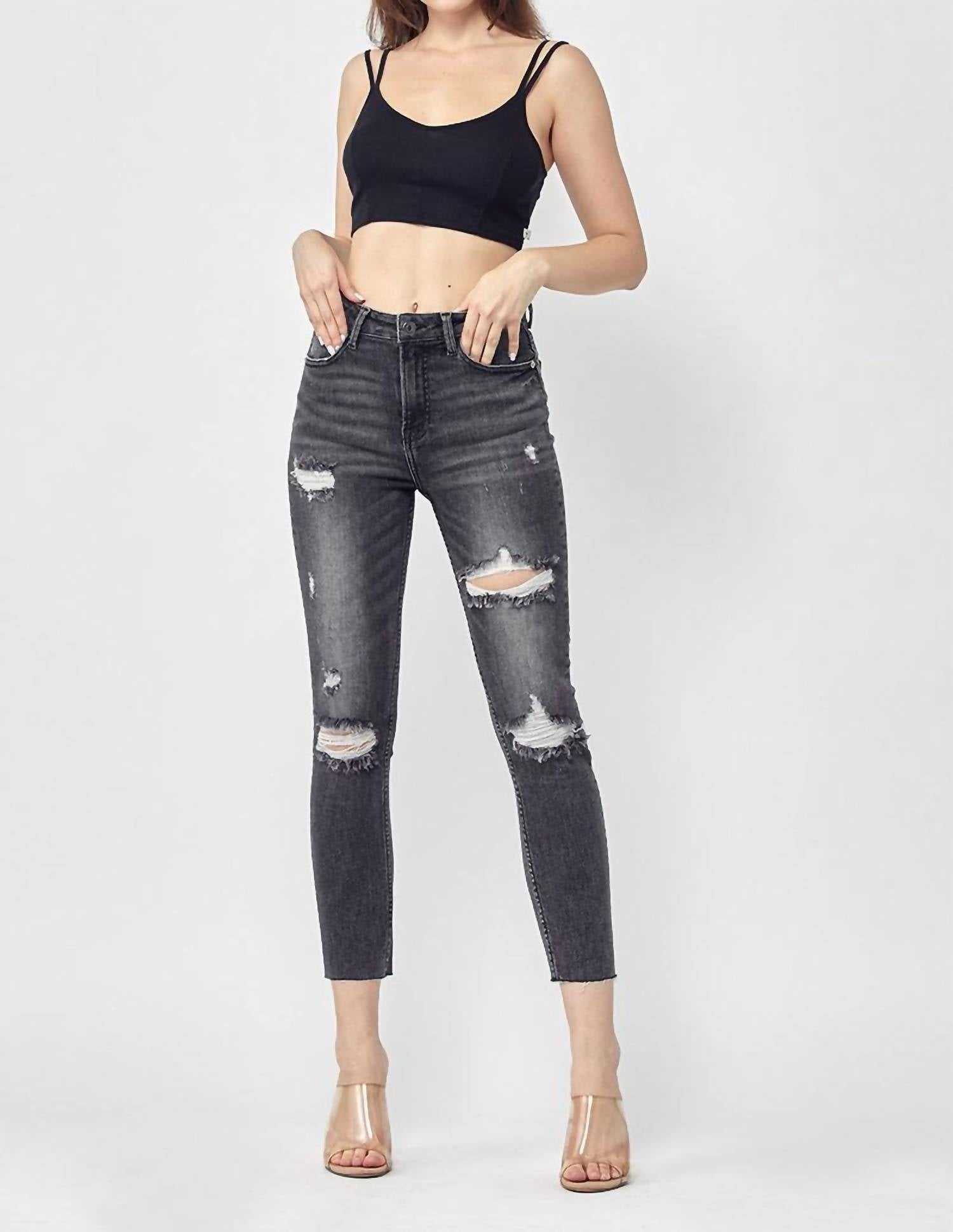Introducing the Olivia High Rise Distressed Skinny Jeans by RISEN, perfect for adding an edge to your spring concert outfits. These black, solid skinny jeans feature a high-rise waist and skinny leg style, providing a flattering fit. The button closure provides a secure fit, while the pockets offer functionality. Made with attention to detail, these jeans are designed for style and comfort.