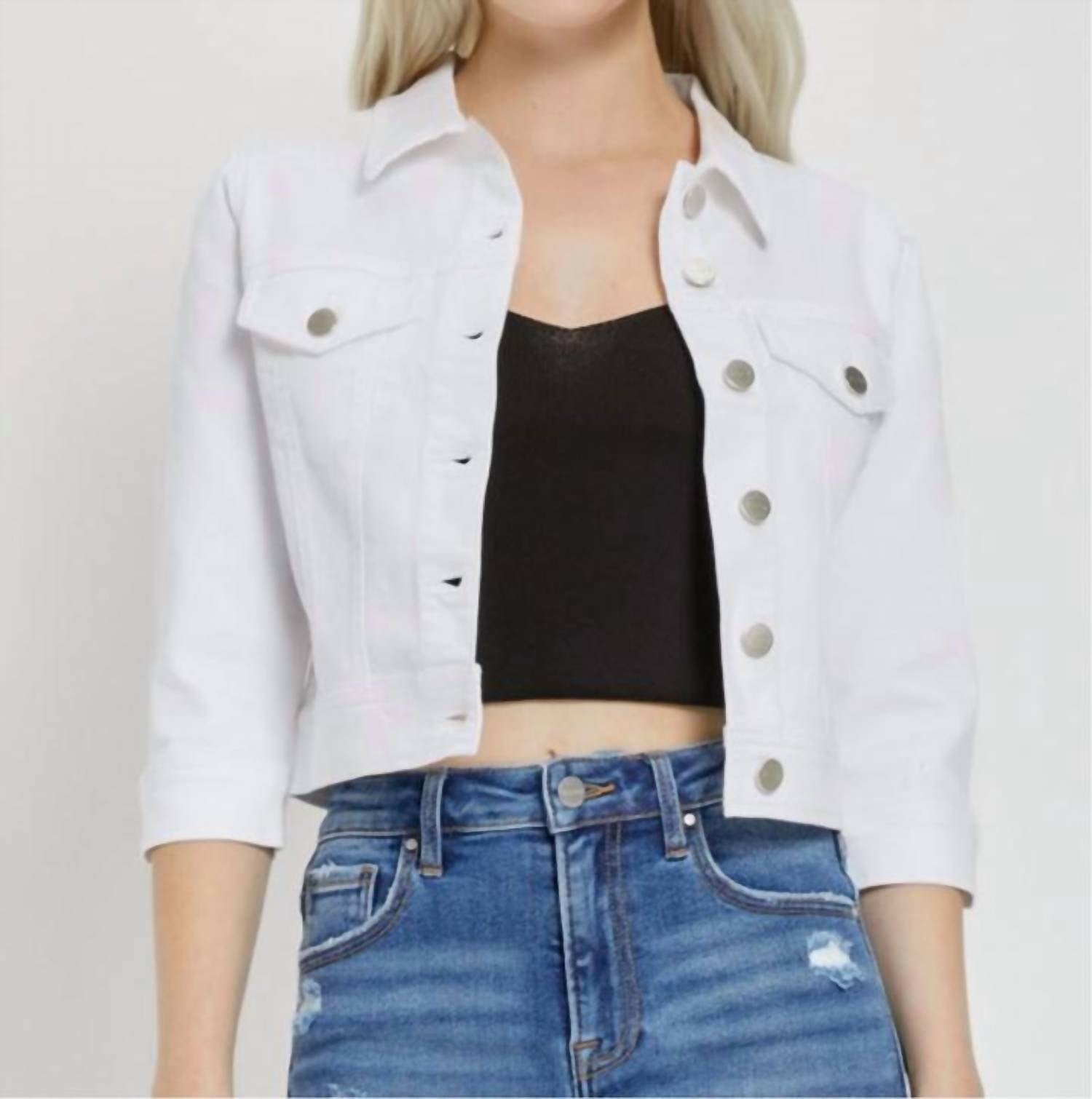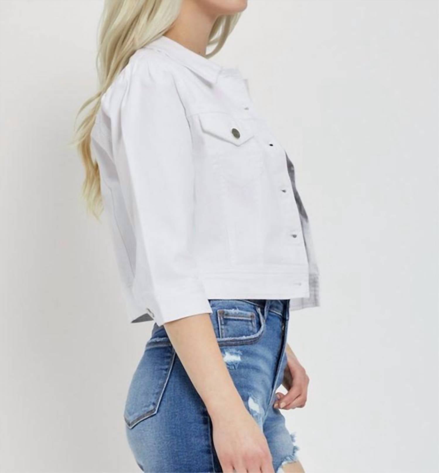 Throw this adorable jacket over just about anything for an effortlessly stylish look. Introducing the RISEN Shirring Sleeve Crop Jacket, a chic addition to any wardrobe in crisp white. This jean jacket features stylish three-quarter shirring sleeves and convenient pockets. Crafted from a cotton blend of 92% cotton, 6% polyester, and 2% spandex, it ensures ultimate comfort and style. Closure: Button closure. Care: Machine wash cold, tumble dry.