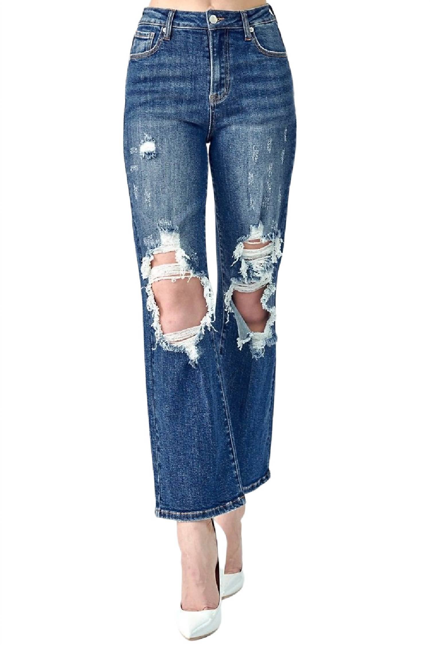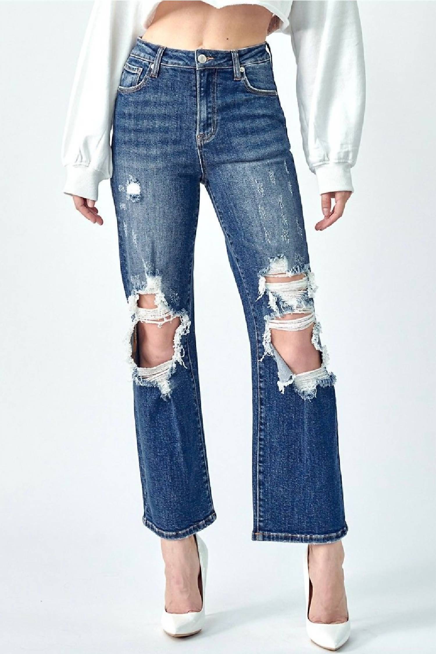These must-have jeans are fit to perfection.Risen Straight Leg High Rise Jeans (Style: RDP5027). Heavily distressed jeans, dark wash. Stretch. These run true to size. Machine wash separately in cold water. Color may vary on your screen. Distressing can vary. Size 3: Inseam 29” / Rise 11". Size 1X: Inseam 30.5" / Rise 13.5". Material: 95% Cotton / 3.5% Polyester / 1.5% Spandex. Sizing: 1/25 | 3/26 | 5/27 | 7/28 | 9/29 | 11/30 | 13/31 | 15/32 | 1XL – 14W/16W | 2XL – 18W/20W | 3XL – 20W/22W.