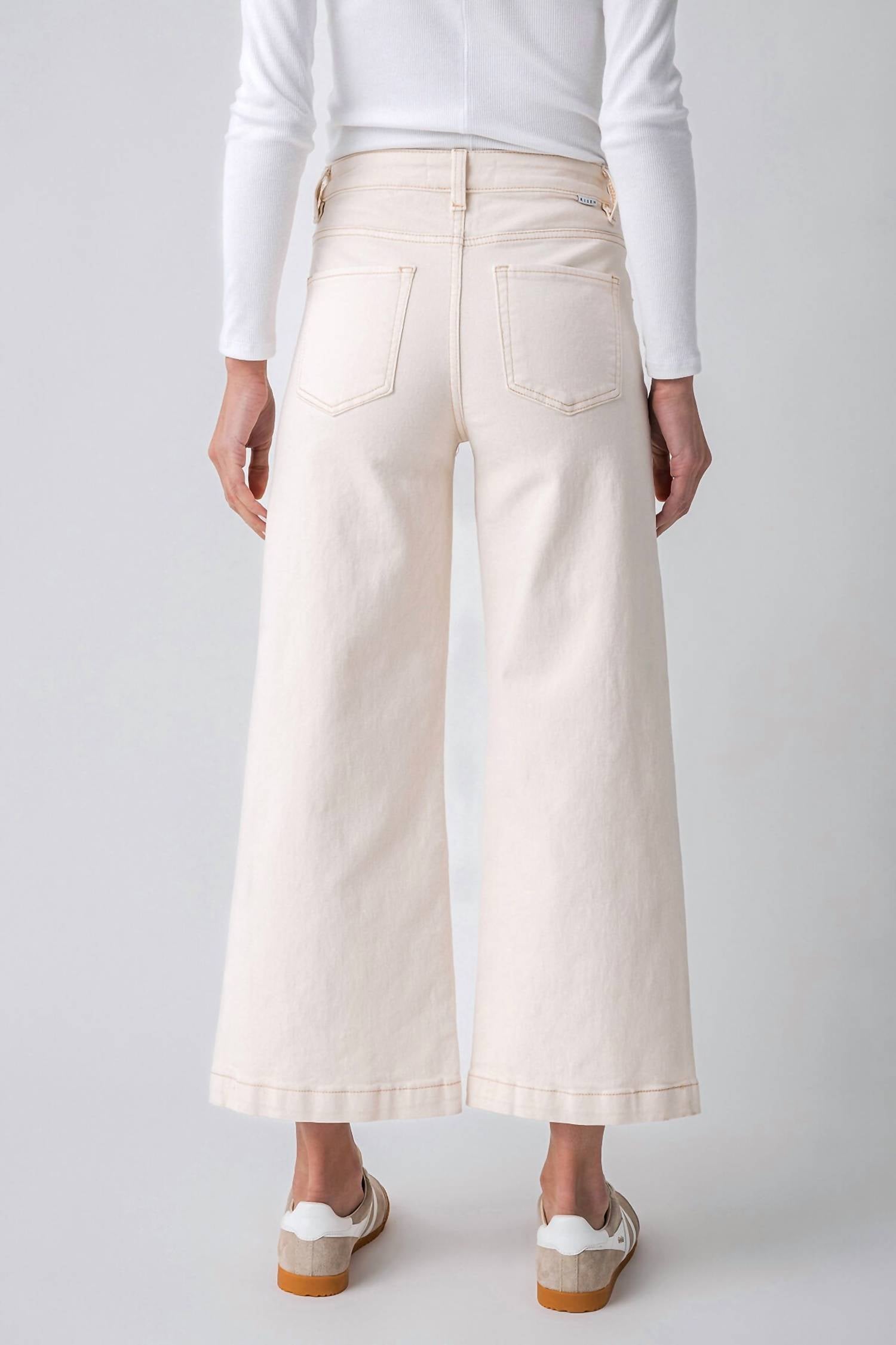 The Risen TC High Rise Wide Leg Pants in Winter White offer a relaxed fit that's perfect for the modern wardrobe. With a high rise of 10 inches and a 26-inch inseam, these wide-leg pants provide both style and comfort. Made from a blend of 94% Cotton, 5% Polyester, and 1% Spandex, they are designed for versatility and ease with a simple pull-on closure. Care for them is straightforward: machine wash cold, inside out, and hang to dry to maintain their light wash preppy look.