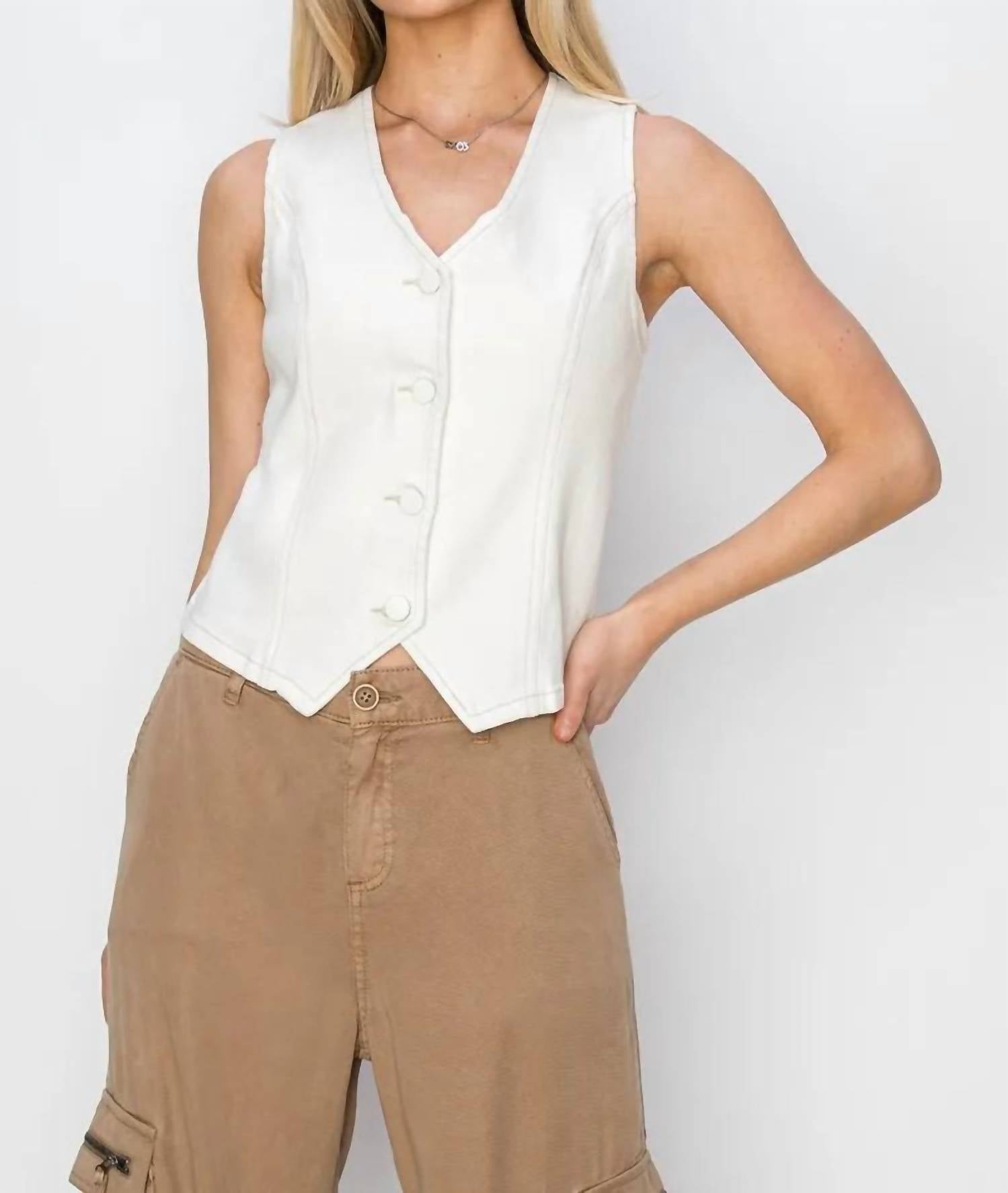 Throw this vest over an all black outfit for a perfectly polished look. Elevate your spring wardrobe with the RISEN V Neck Button Down Vest in a versatile white hue. Tailored for a flattering fit, this sleeveless vest features a button closure and a sophisticated V-neckline. Crafted from a durable cotton blend composed of 98% Cotton and 2% Spandex, it offers stylish ease with no stretch for crisp structure. Care is simple with machine wash cold and tumble dry low, making it a practical choice for transitional layering, perfect for casual or polished looks. Measurements include a consistent top length of 21.8 inches across available sizes: S (Bust 35"), M (37"), L (39"), XL (41").