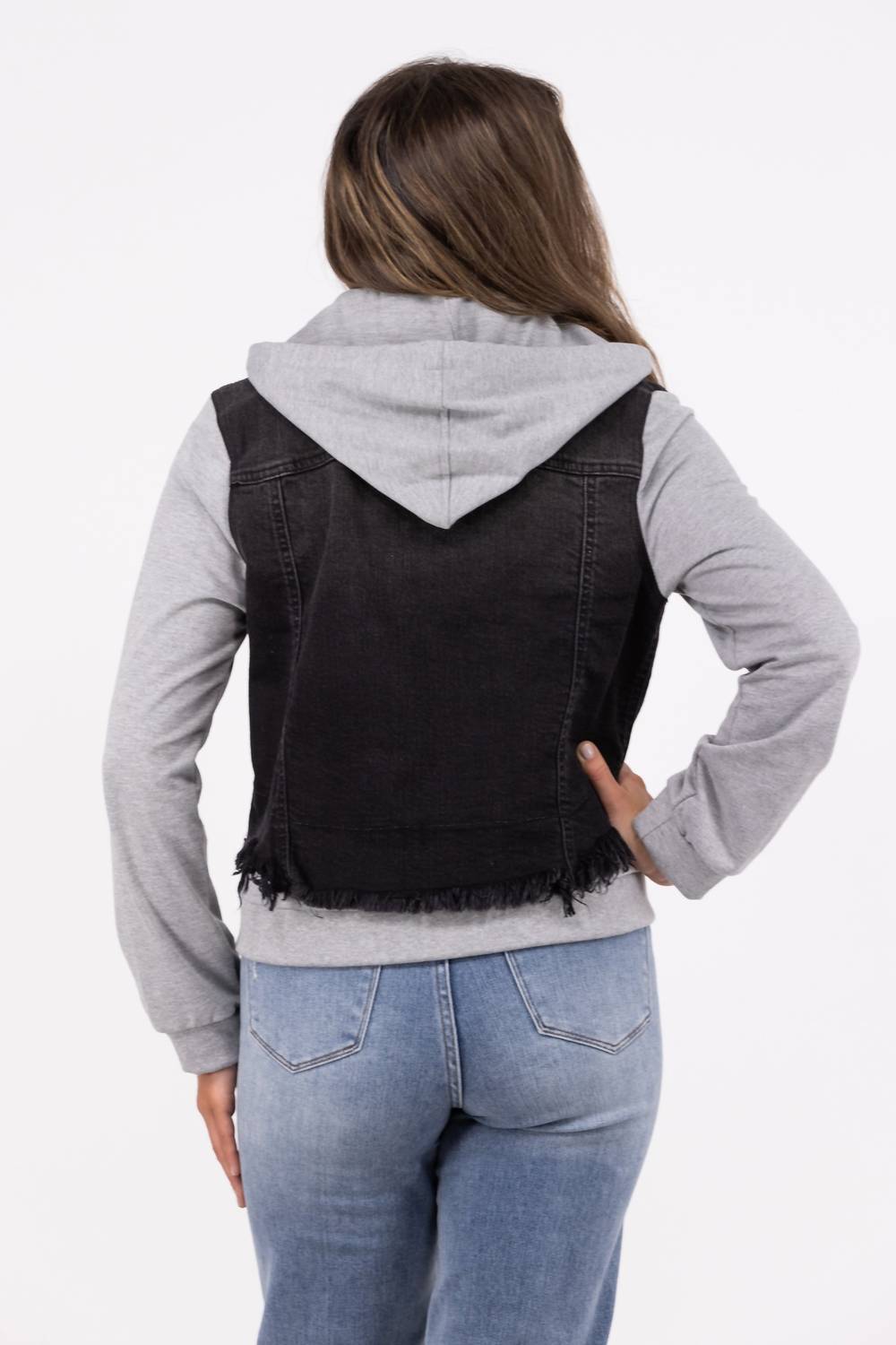 The perfect jean jacket for those slightly crisper days between seasons. Featuring long sleeves and crafted from a comfortable cotton blend, this cropped jacket includes practical elements such as two chest and side pockets. Its distinctive touch comes from a detachable fabric hood and raw cut frayed hem, complemented by a classic button closure. It measures 22 inches in length for size Medium.