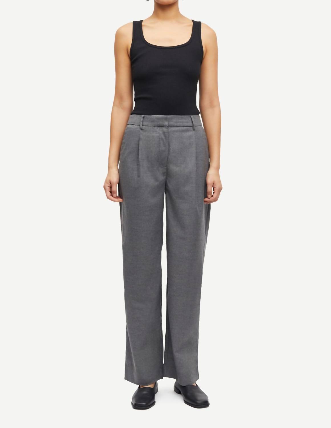 These mid-waist, high-rise trousers feature a regular fit with a wide, straight leg and a mélange look. Crafted from a stretch material blend of 69% Polyester, 29% Viscose, and 2% Elastane with 100% Cotton inserts, they offer both comfort and structure. Features like zipper and hook closure, side slit pockets, and pressed creases enhance their classic appeal.