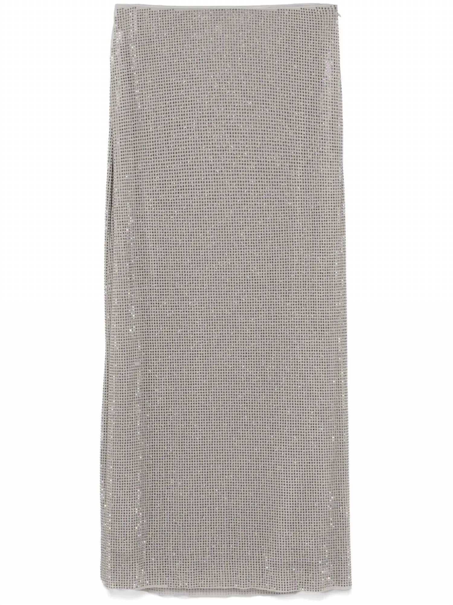Who doesn't love a good maxi skirt? Sophisticated light grey hue. Mid-length skirt. Crafted from a recycled polyester blend, woven with a delicate mesh design and rhinestone embellishments. Featuring a concealed side zip closure and an elasticated waistband for a snug fit. Fully lined for added comfort. 95% Recycled Polyester, 5% Elastane. Hand wash.