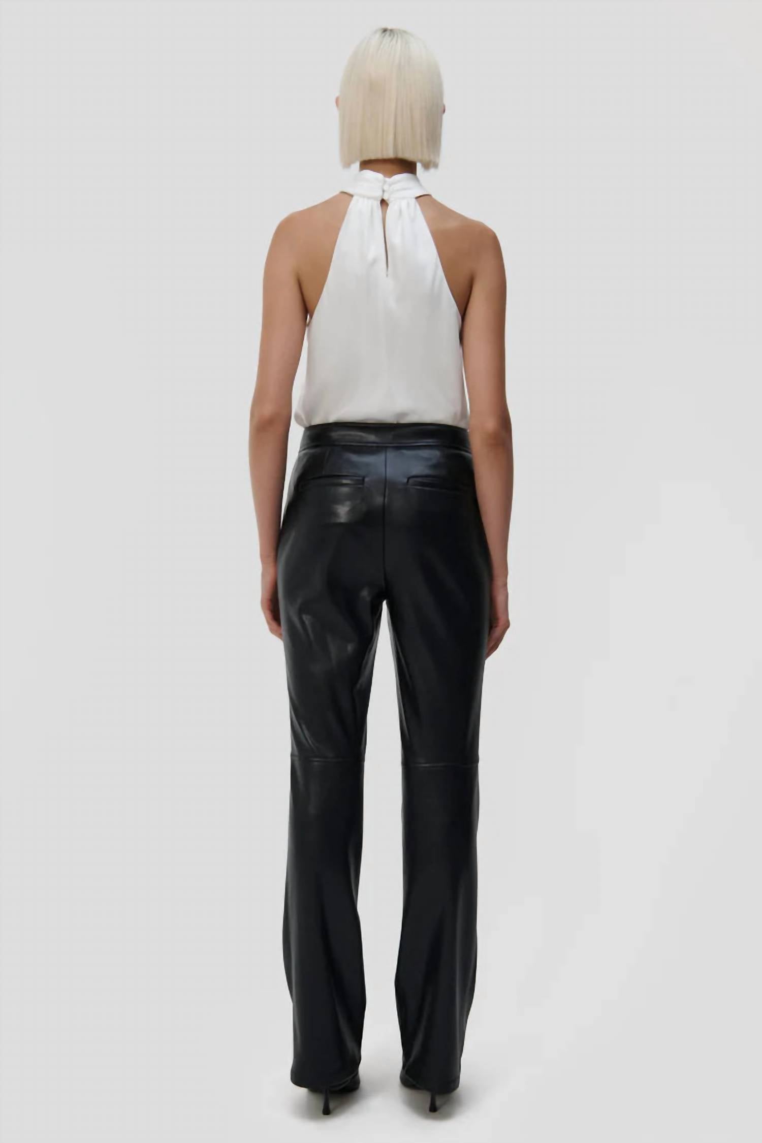 Elevate your wardrobe with the SIMKHAI Dahlia Straight Leg Faux Leather Pant in an elegant black hue. These women's trousers feature a mid-rise waist and a relaxed, straight leg fit, crafted from a supple blend of 50% Polyurethane and 50% Polyester. Enjoy the comfort of its lined interior with 60% Viscose and 40% Rayon. Featuring a convenient zip closure, these imported pants are designed for easy styling and care, simply dry clean them to maintain their sophisticated look.
