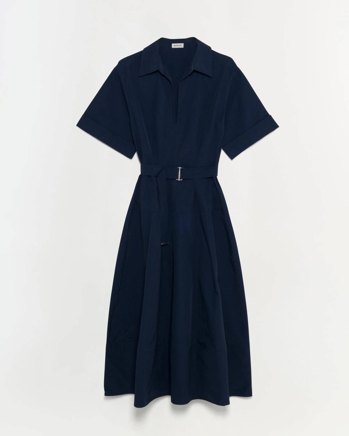 A midi dress so versatile, your options for wearing it are endless. Discover the Deanna Belted Midi Dress by SIMKHAI, a sophisticated choice in midnight blue perfect for fall gatherings. This dress boasts elbow-length sleeves and is crafted from structured cotton faille, composed of 62% cotton and 38% polyamide, offering a timeless silhouette with a defined waist and voluminous skirt. It features an empire waist, side zipper closure, and practical pockets.