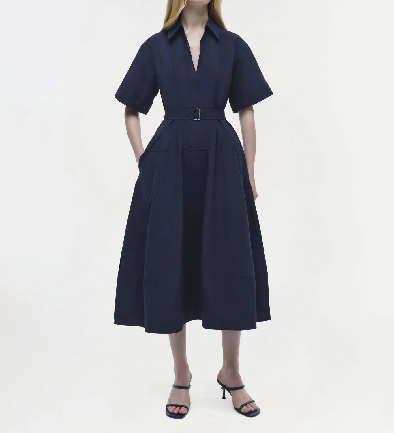 Discover the Deanna Belted Midi Dress by SIMKHAI, a sophisticated choice in midnight blue perfect for fall gatherings. This dress boasts elbow-length sleeves and is crafted from structured cotton faille, composed of 62% cotton and 38% polyamide, offering a timeless silhouette with a defined waist and voluminous skirt. It features an empire waist, side zipper closure, and practical pockets.