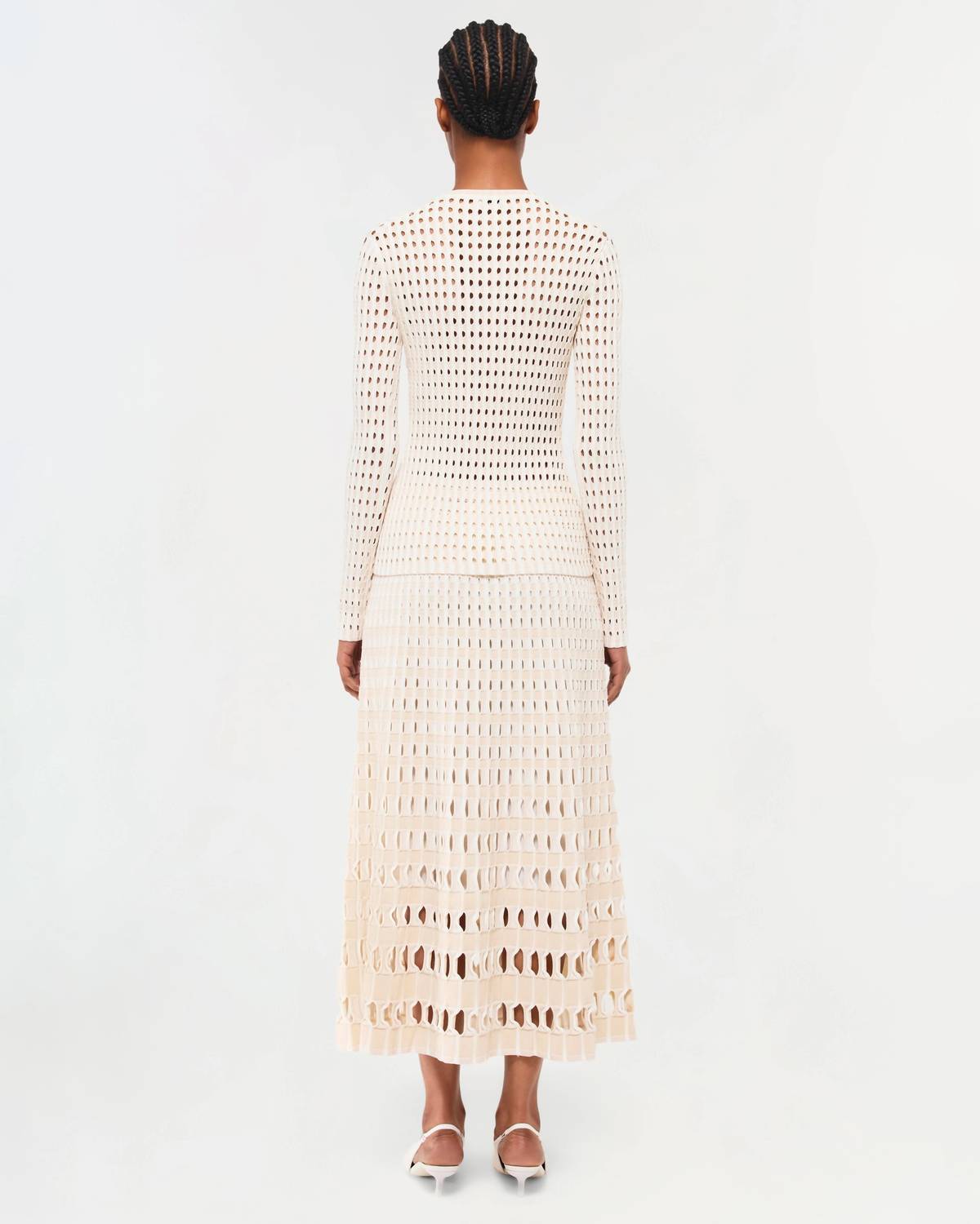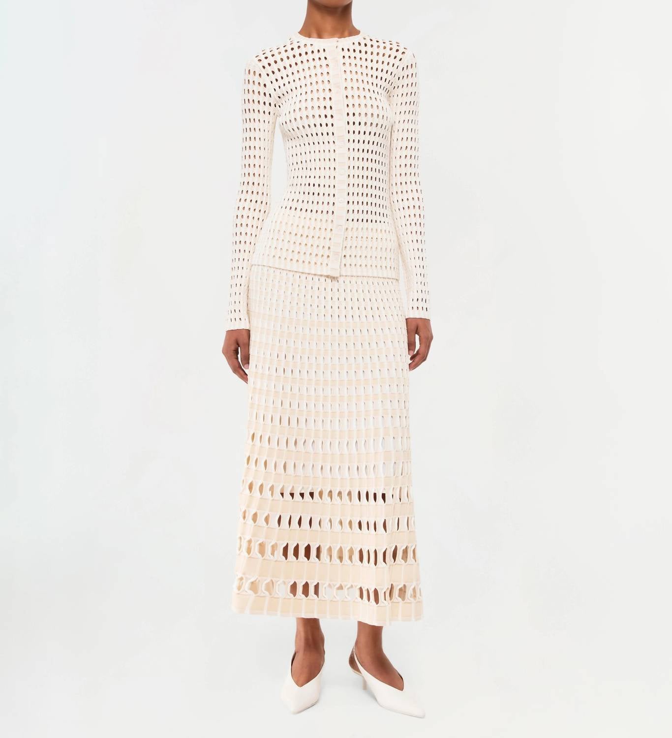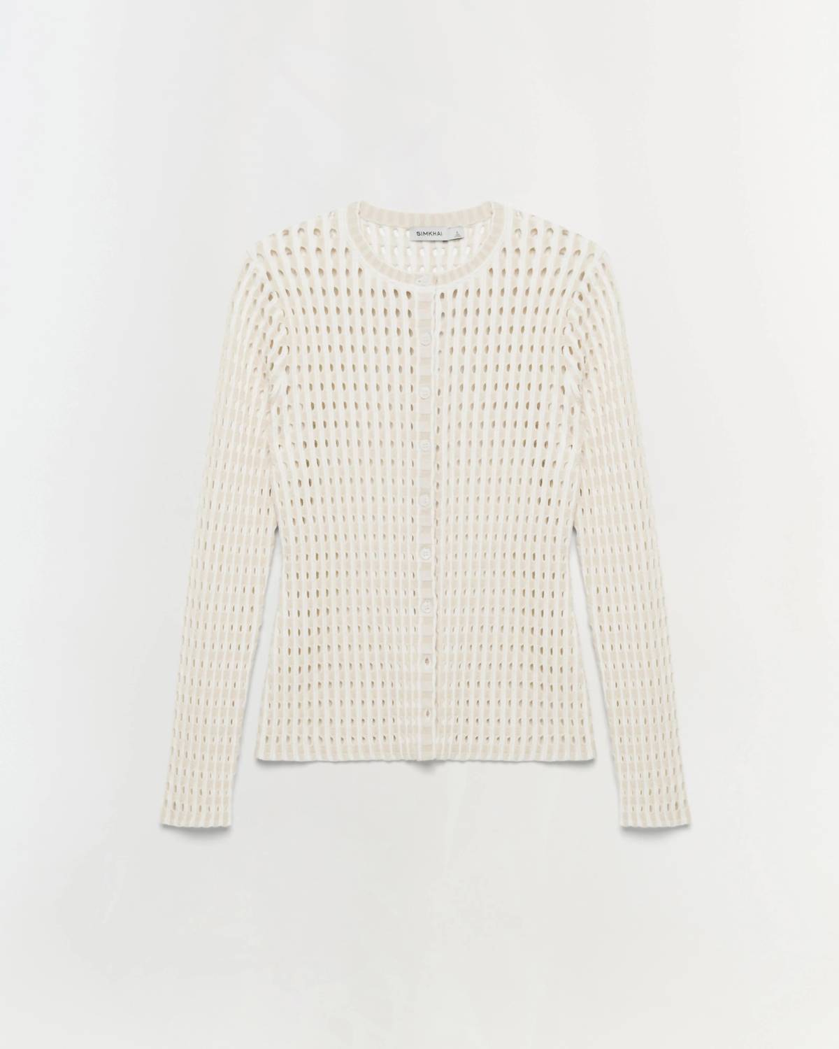 A classic fit that works just as good buttoned as it does left open. Introducing the Gracen Knit Cardigan by SIMKHAI, a sophisticated addition to your fall wardrobe in a natural hue. This cardigan features long sleeves and a modern design with a textured gingham pattern, perfect for quiet luxury occasions. Crafted from 83% Rayon and 17% Polyester, it boasts a button front closure, and a refined crewneck for polished elegance.