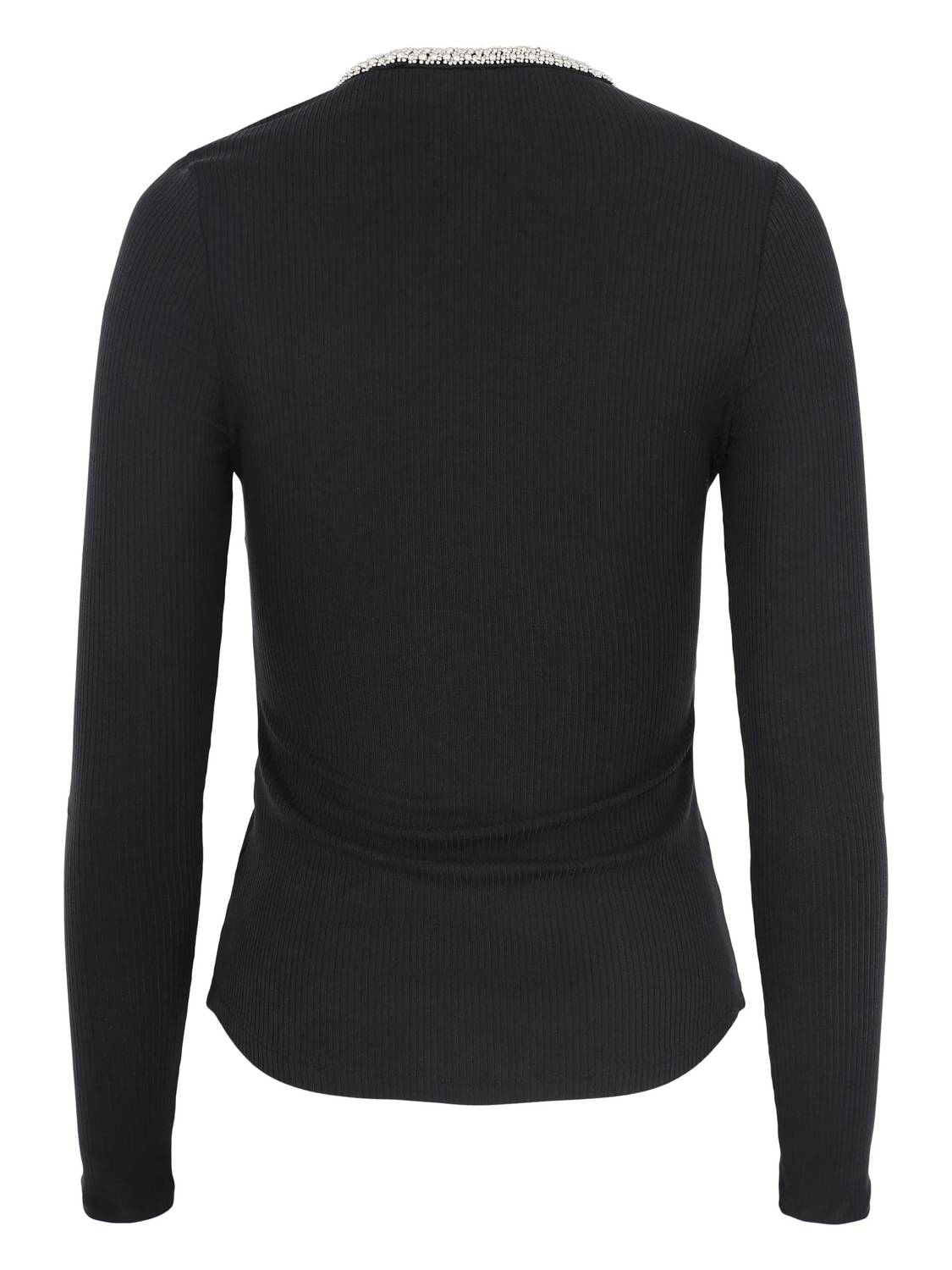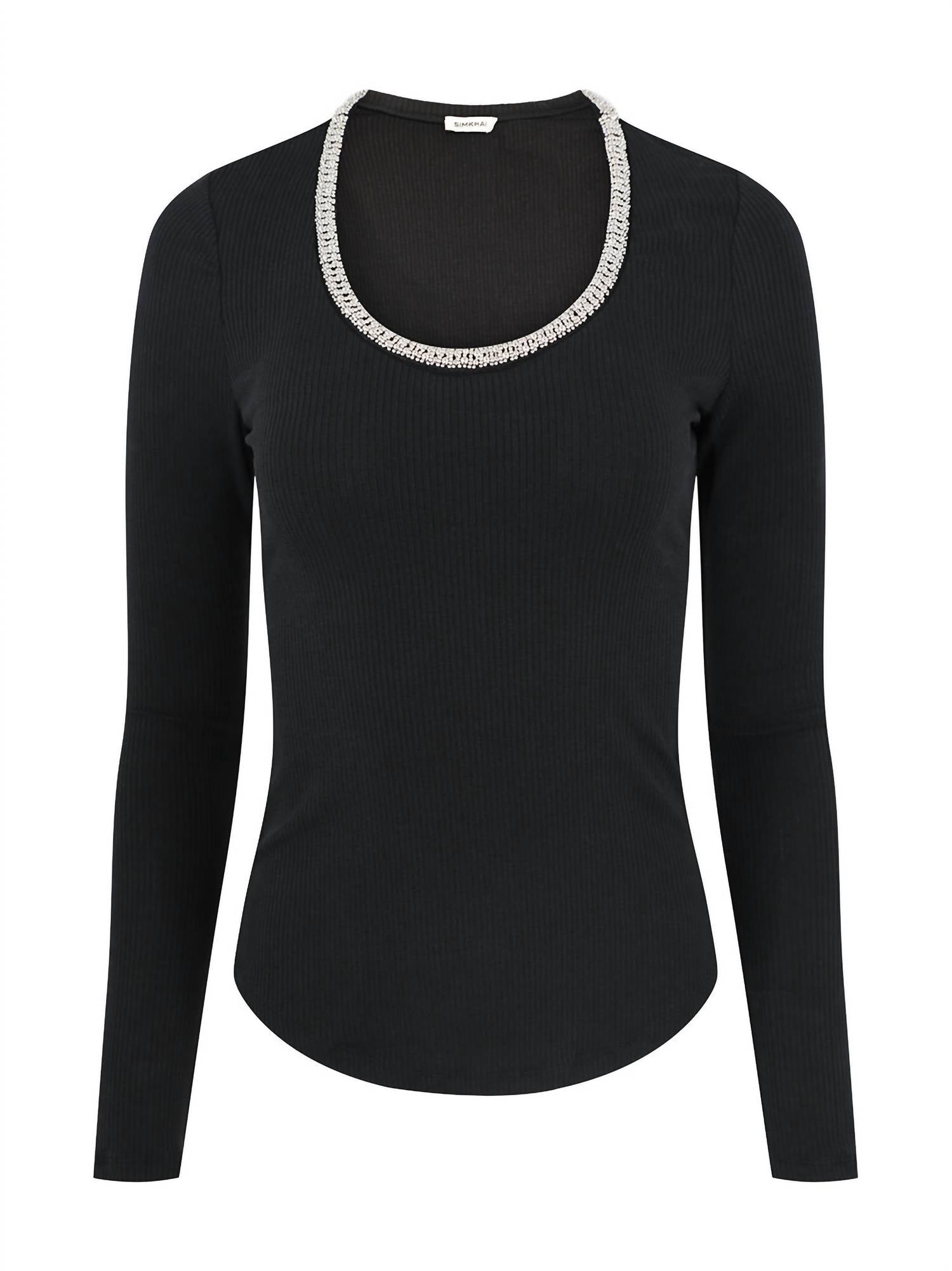 Pair this with your favorite jeans and slides for your next girls night out. Elevate your wardrobe with the SIMKHAI Janay Long Sleeve U-Neck Top in Black, a chic choice for any event. This top showcases a timeless U-neck design with elegant crystal detailing along the neckline, perfectly complemented by its long sleeves. Experience the ease of its pull-on closure, offering both style and convenience. Crafted for women who appreciate sophisticated elegance, this versatile piece is a must-have in your collection.